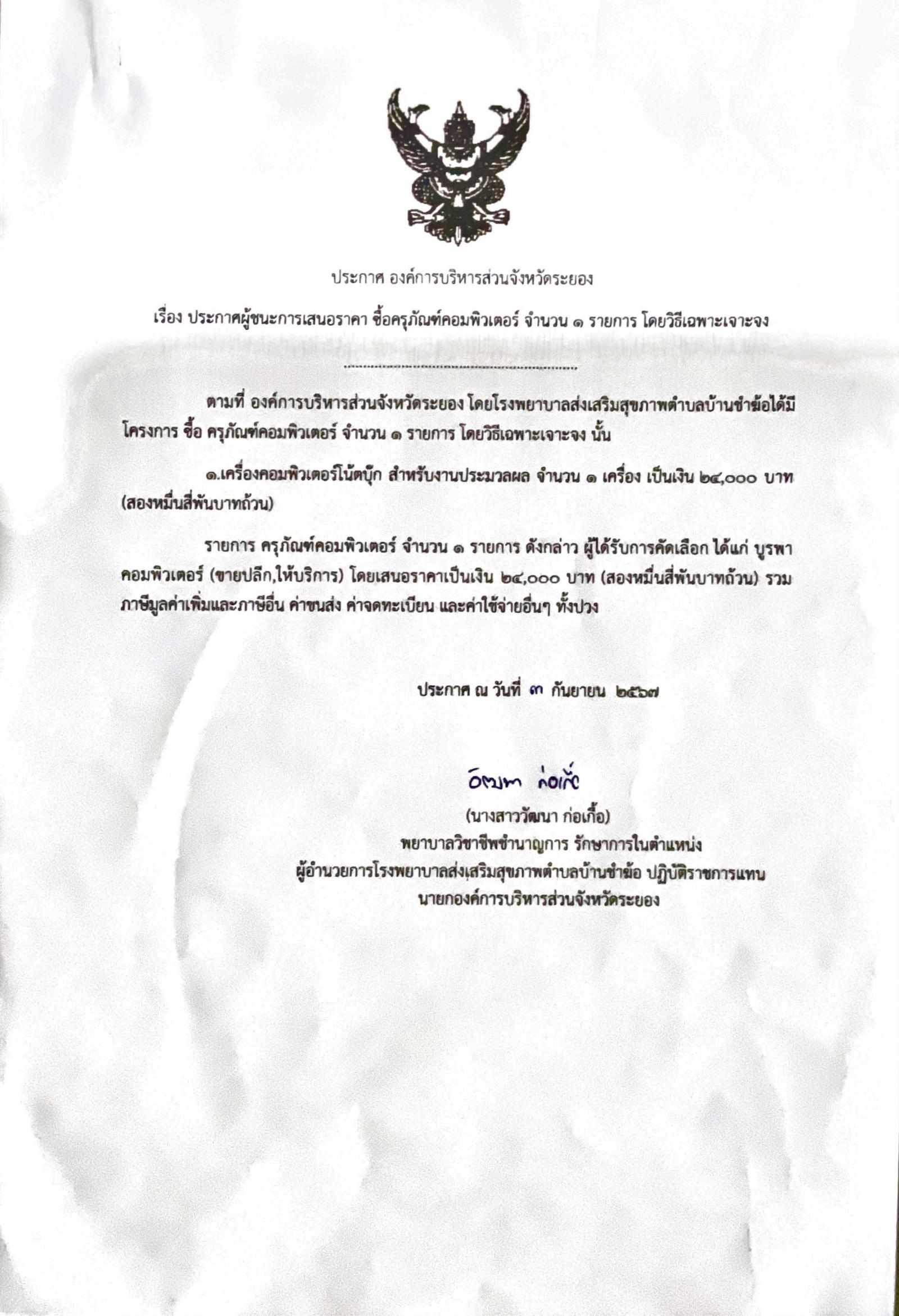 ประกาศผู้ชนะการเสนอราคา ซื้อครุภัณฑ์คอมพิวเตอร์ จำนวน 3 รายการ โดยวิธีเฉพาะเจาะจง