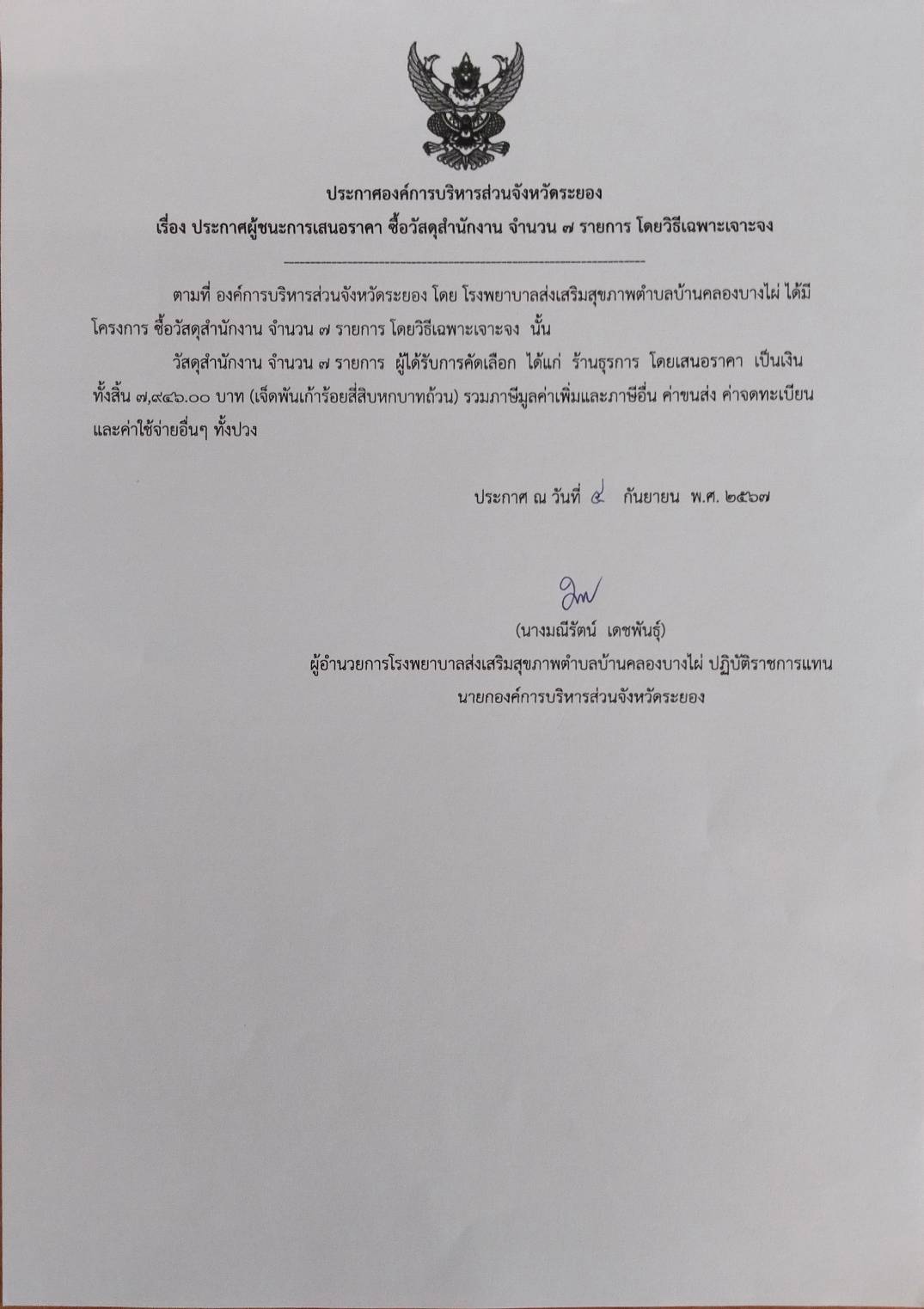 รพ.สต.บ้านคลองบางไผ่ > ข่าวสาร ประกาศ ประกาศผู้ชนะเสนอราคาซื้อวัสดุสำนักงาน จำนวน 7 รายการ โดยวิธีเฉพาะเจาะจง