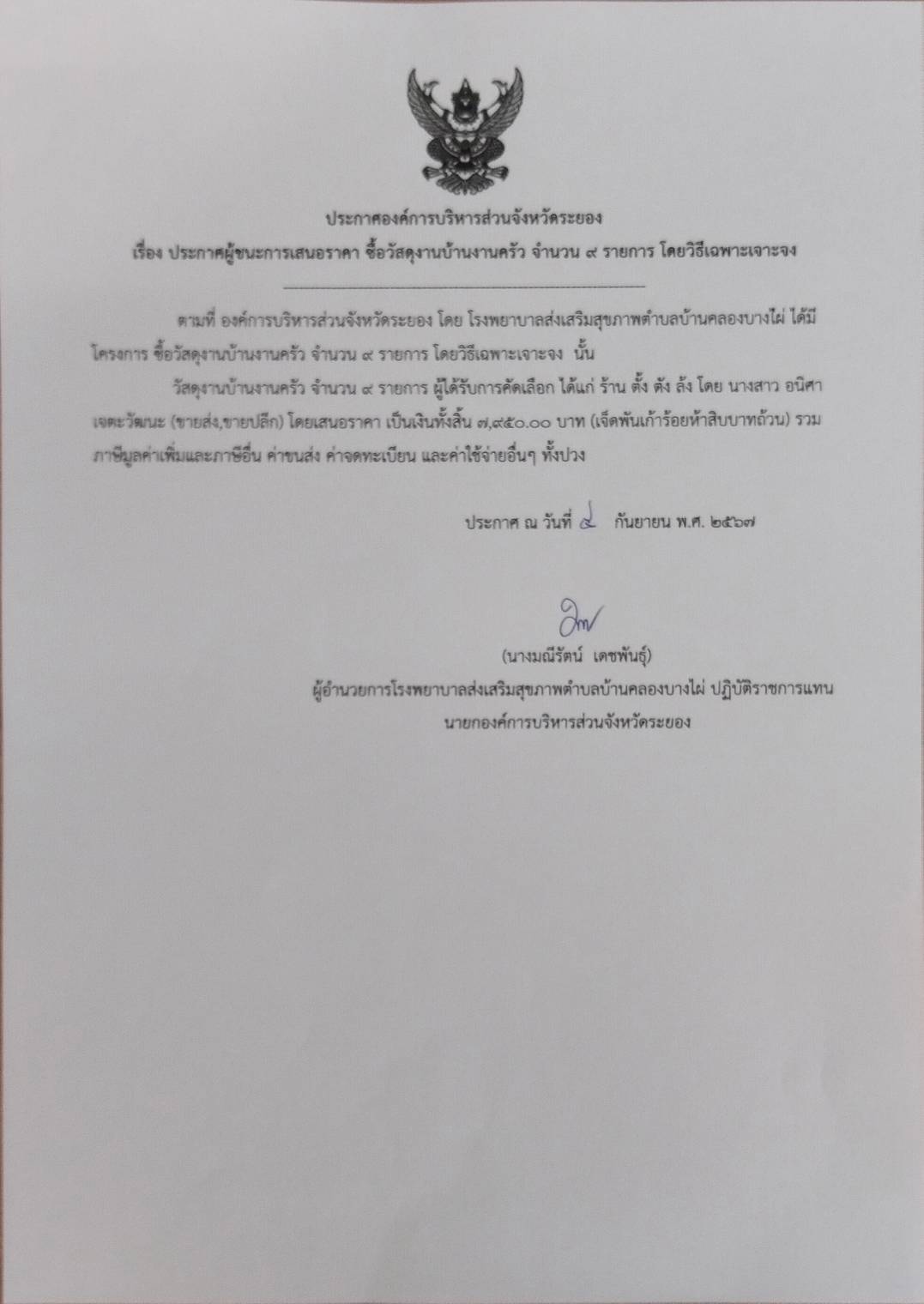 รพ.สต.บ้านคลองบางไผ่ > ข่าวสาร ประกาศ ประกาศผู้ชนะเสนอราคาซื้อวัสดุงานบ้านงานครัว จำนวน 9 รายการ โดยวิธีเฉพาะเจาะจง