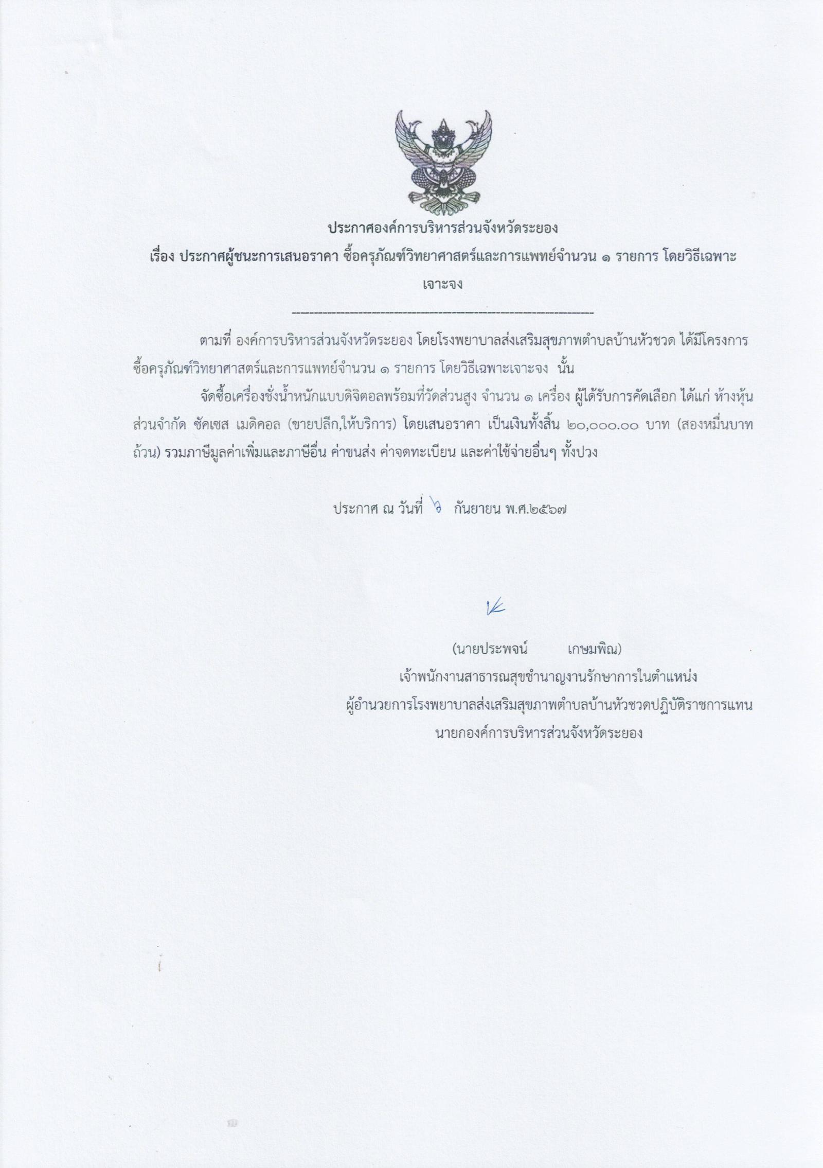 ประกาศผู้ชนะการเสนอราคา ซื้อครุภัณฑ์วิทยาสตร์และการแพทย์จำนวน 1 รายการ โดยวิธีเฉพาะเจาะจง