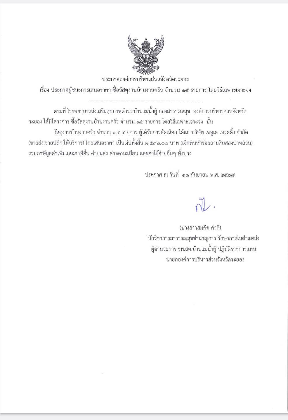 ประกาศผู้ชนะการเสนอราคา ซื้อวัสดุงานบ้านงานครัว จำนวน 15 รายการ โดยวิธีเฉพาะเจาะจง