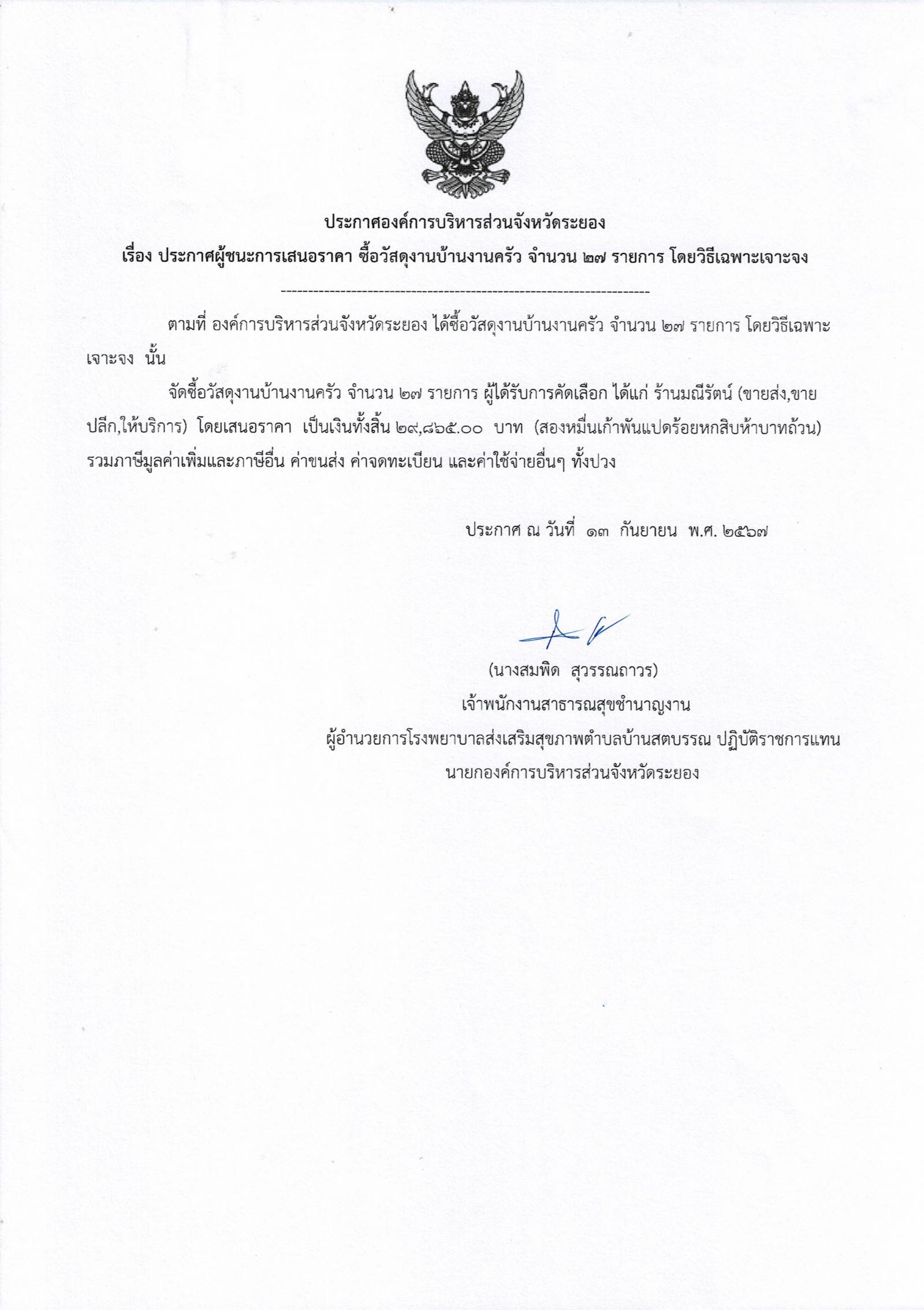ประกาศผู้ชนะการเสนอราคา ซื้อวัสดุงานบ้านงานครัว จำนวน 27 รายการ โดยวิธีเฉพาะเจาะจง