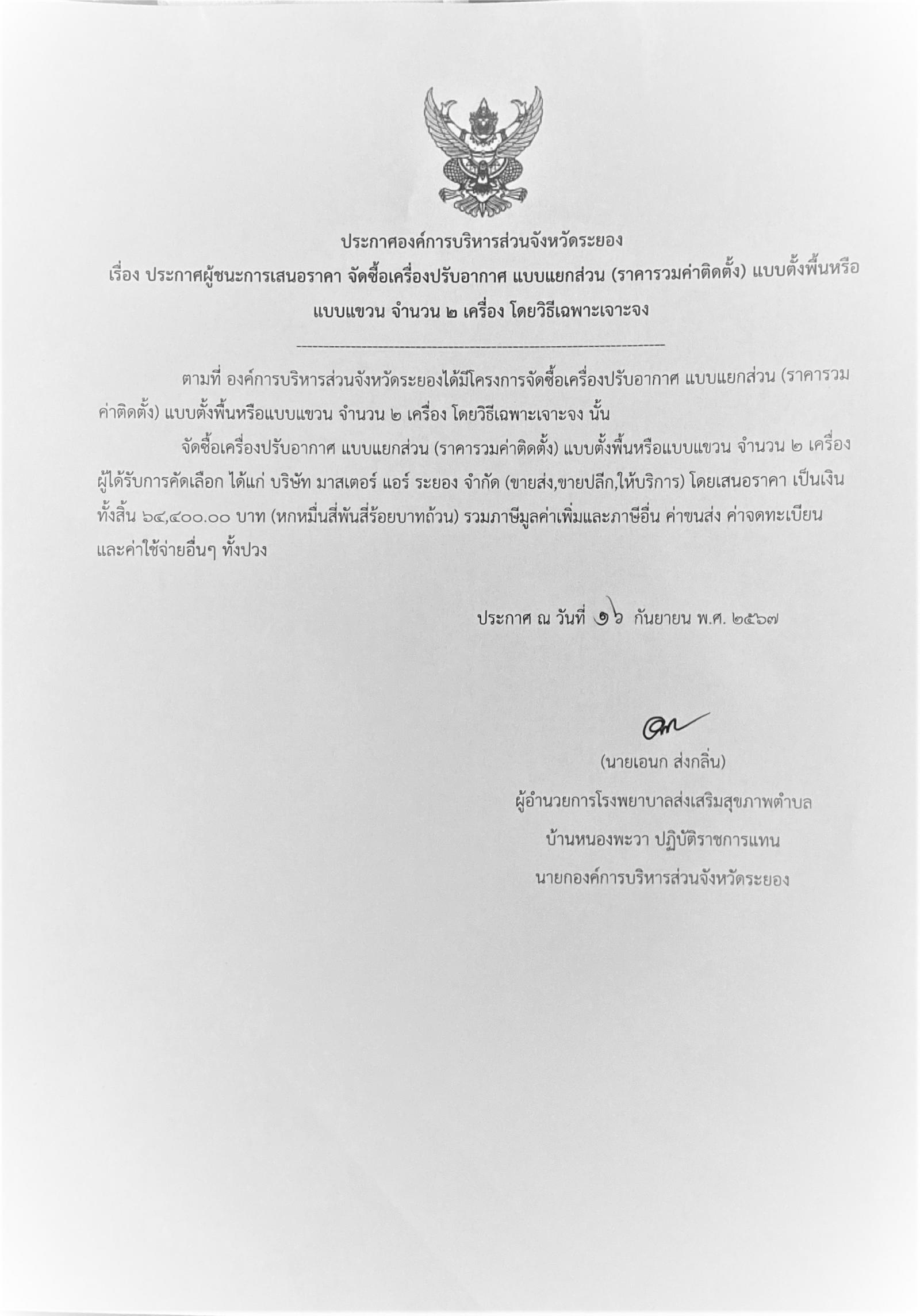 ประกาศผู้ชนะการเสนอราคา จัดซื้อเครื่องปรับอากาศ แบบแยกส่วน (ราคารวมค่าติดตั้ง) แบบตั้งพื้นหรือ แบบแขวน จำนวน 2 เครื่อง โดยวิธีเฉพาะเจาะจง