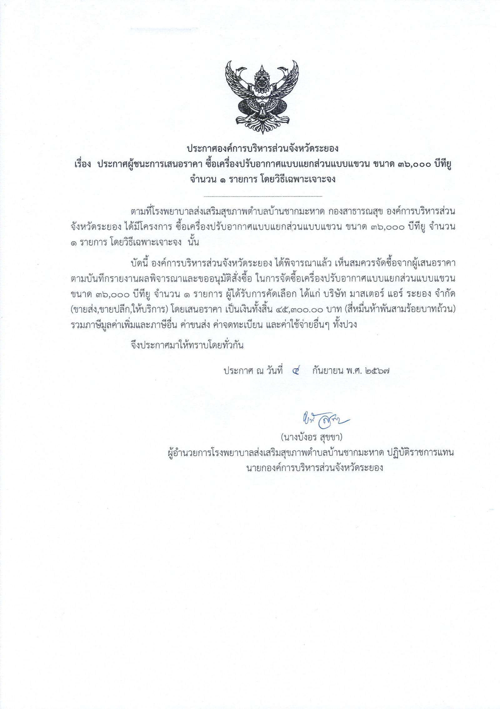 ประกาศผู้ชนะการเสนอราคา ซื้อเครื่องปรับอากาศแบบแยกส่วนแบบแขวน ขนาด 36,000 บีทียู จำนวน 1 รายการ โดยวิธีเฉพาะเจาะจง
