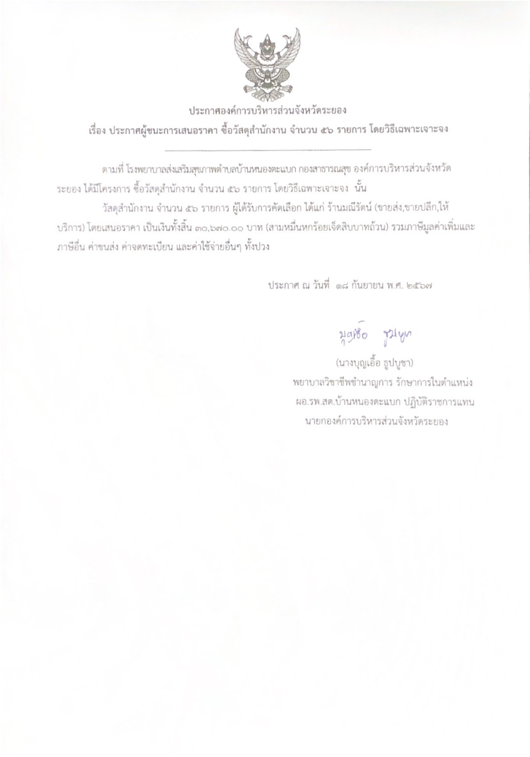 ประกาศผู้ชนะการเสนอราคา ซื้อวัสดุสำนักงาน จำนวน 56 รายการ โดยวิธีเฉพาะเจาะจง