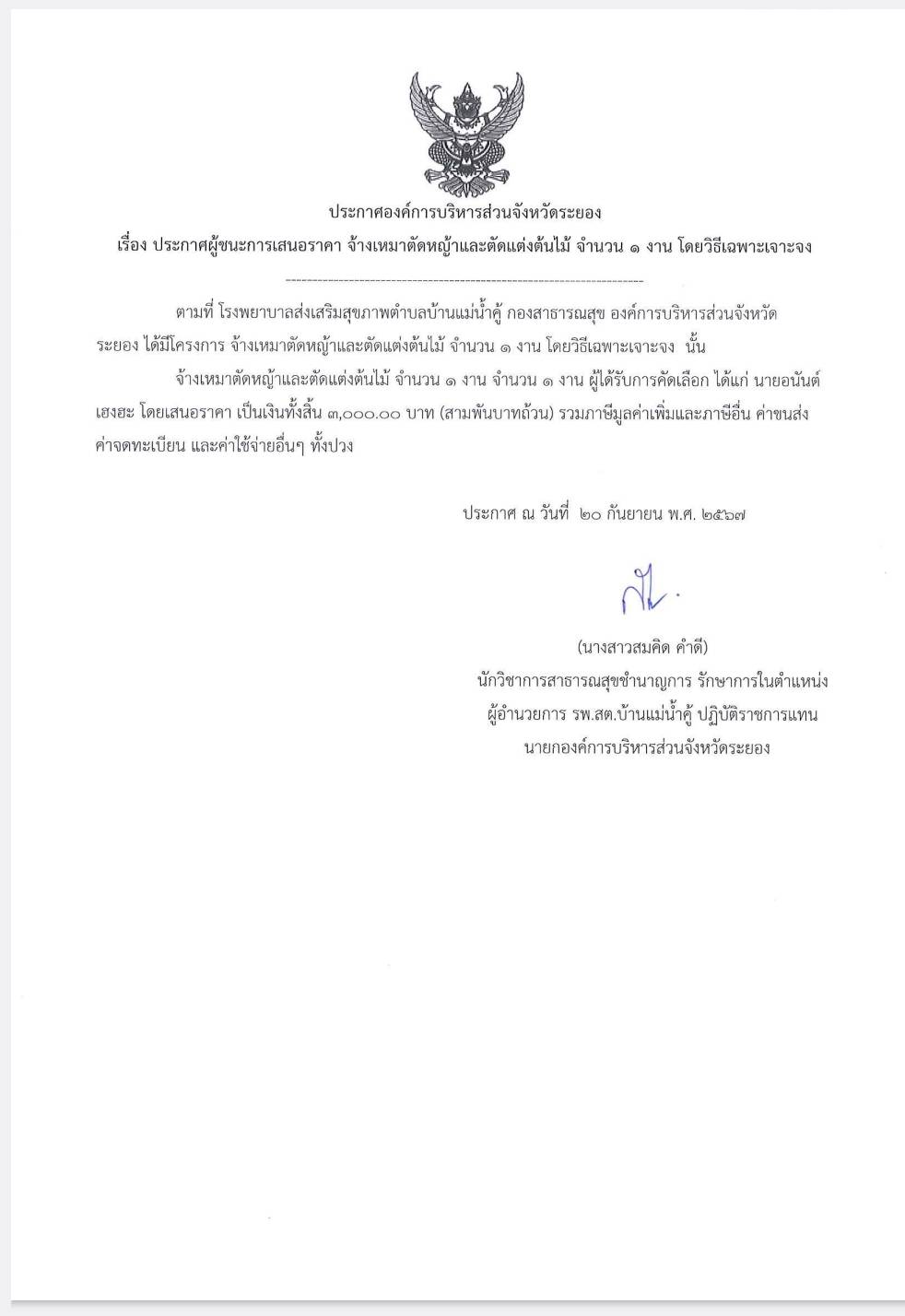 รพ.สต.บ้านแม่น้ำคู้ > ประกาศจัดซื้อจัดจ้าง ประกาศผู้ชนะการเสนอราคาจ้างเหมาตัดหย้าและตัดแต่งต้นไม้ จำนวน ๑ งาน โดยวิธีเฉพาะเจาะจง