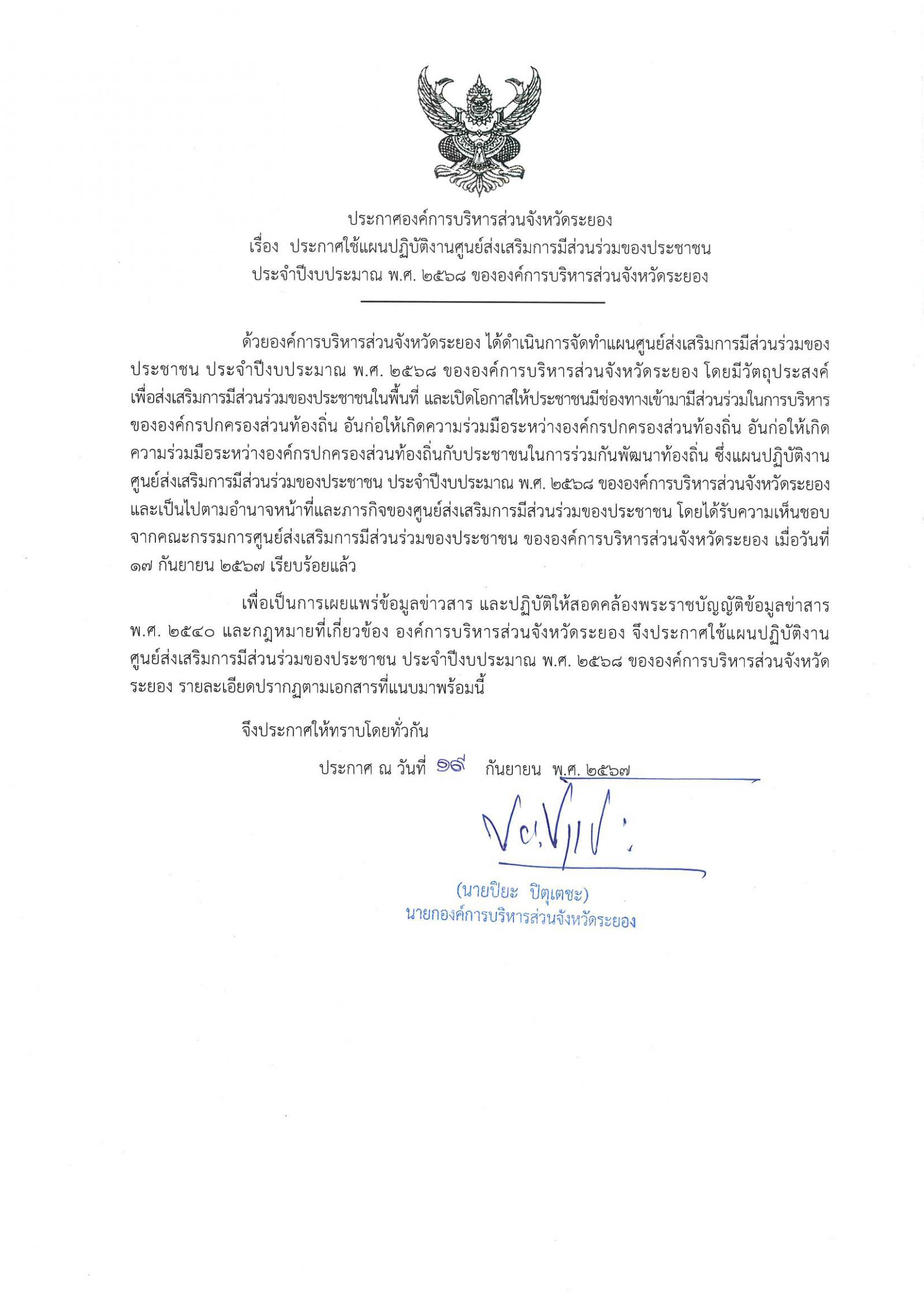 แผนการปฏิบัติงานศูนย์ส่งเสริมการมีส่วนร่วมของประชาชน ประจำปีงบประมาณ ๒๕๖๘