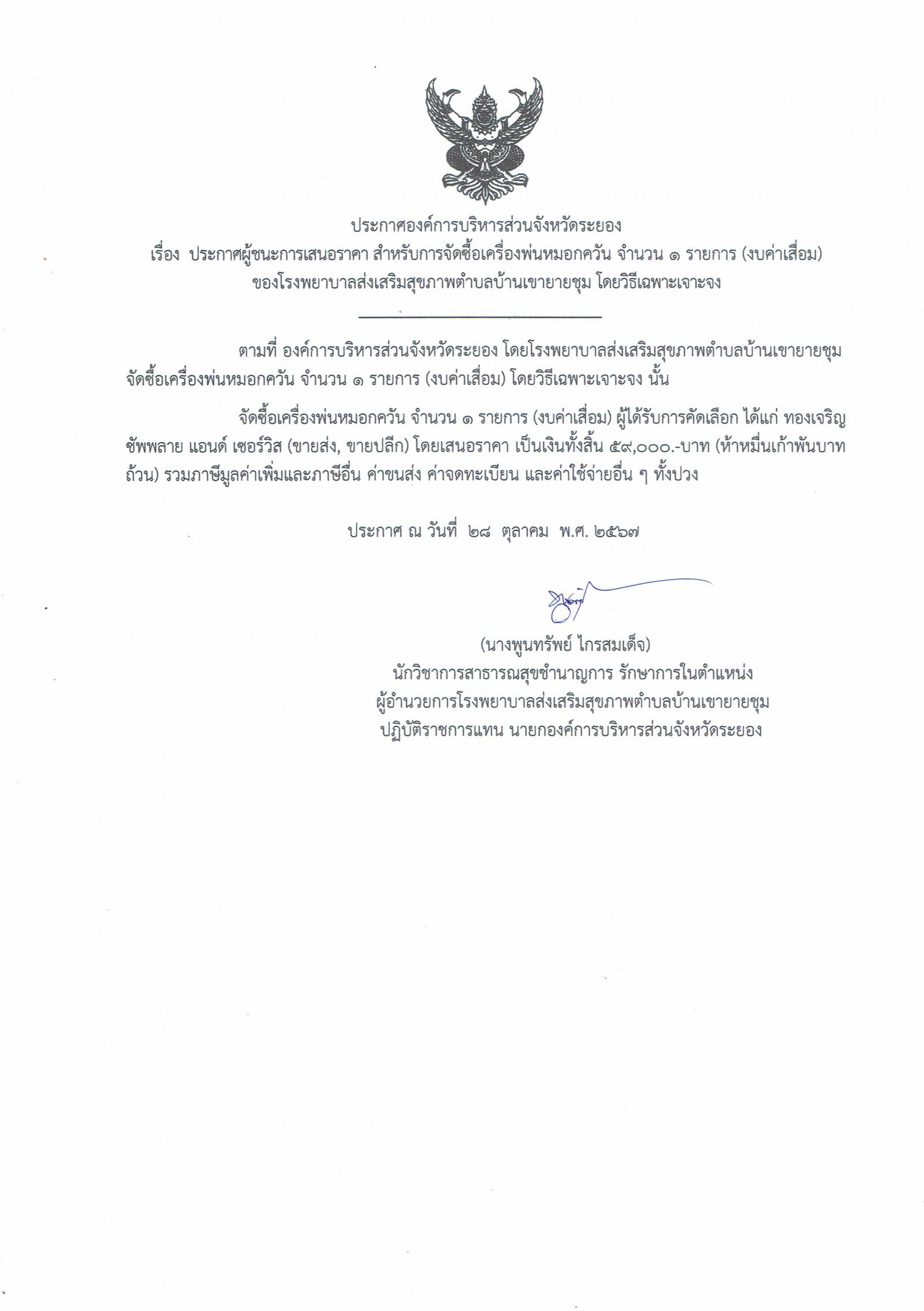 ประชุมผู้ชนะการเสนอราคา สำหรับการจัดซื้อเครื่องพ่นหมอกควัน จำนวน 1 รายการ (งบค่าเสื่อม) ของ รพ.สต.บ้านเขายายชุม โดยวิธีเฉพาะเจาะจง