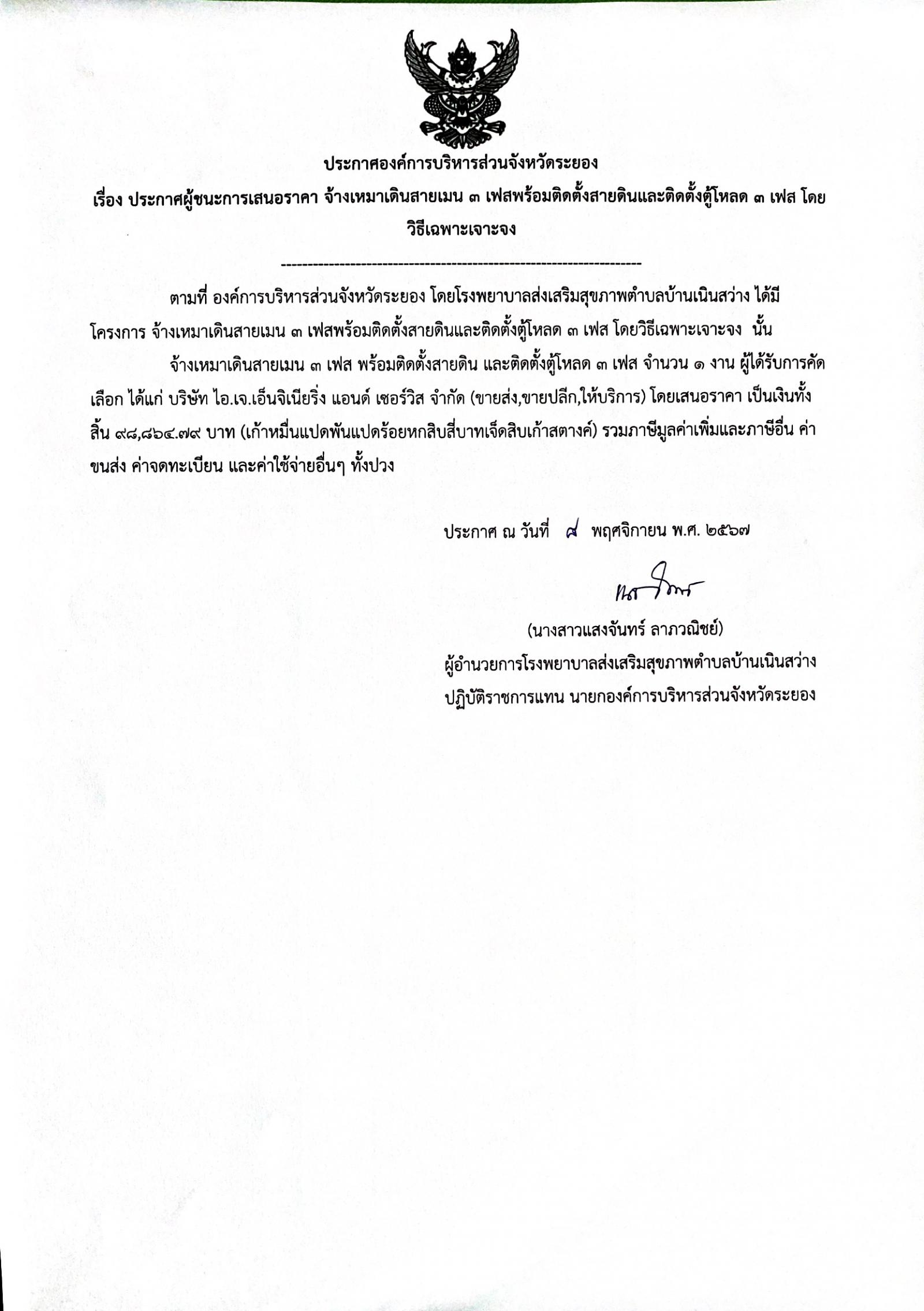 ประกาศผู้ชนะการเสนอราคา จ้างเหมาเดินสายเมน 3 เฟสพร้อมติดตั้งสายดินและติดตั้งตู้โหลด 3 เฟส โดยวิธีเฉพาะเจาะจง