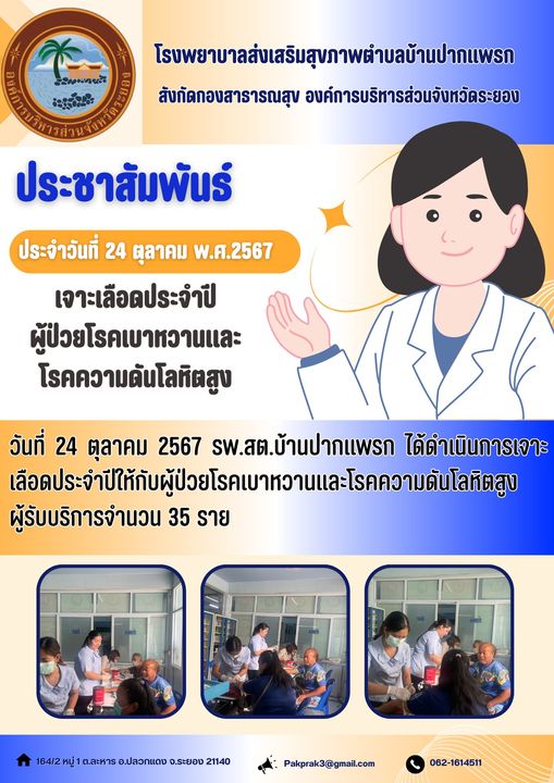 วันที่ 24 ต.ค. 2567 เจาะเลือดประจำปีผู้ป่วยโรคเบาหวนและโรคความดันโลหิตสูง