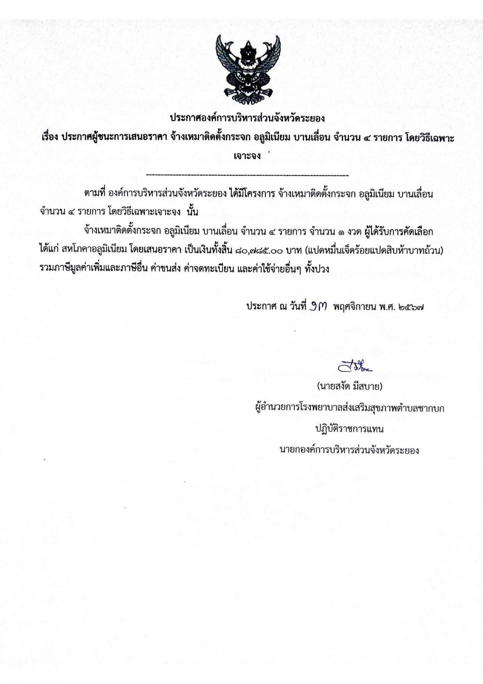 ประกาศผู้ชนะการเสนอราคา จ้างเหมาติดตั้งกระจก อลูมิเนียม บานเลื่อน จำนวน 4 รายการ โดยวิธีเฉพาะเจาะจง