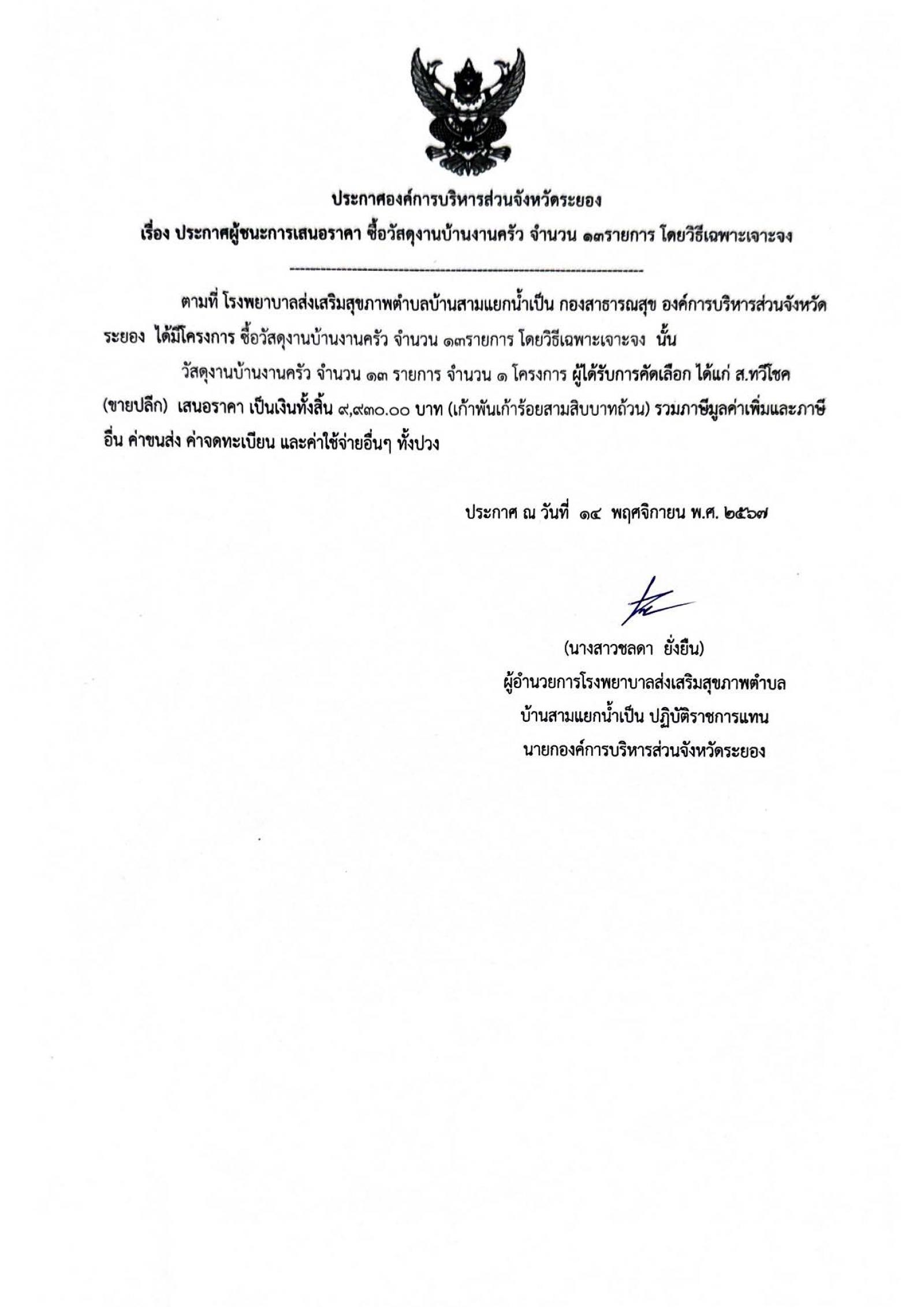 ประกาศผู้ชนะการเสนอราคา ซื้อวัสดุงานบ้านงานครัว จำนวน 13 รายการ โดยวิธีเฉพาะเจาะจง