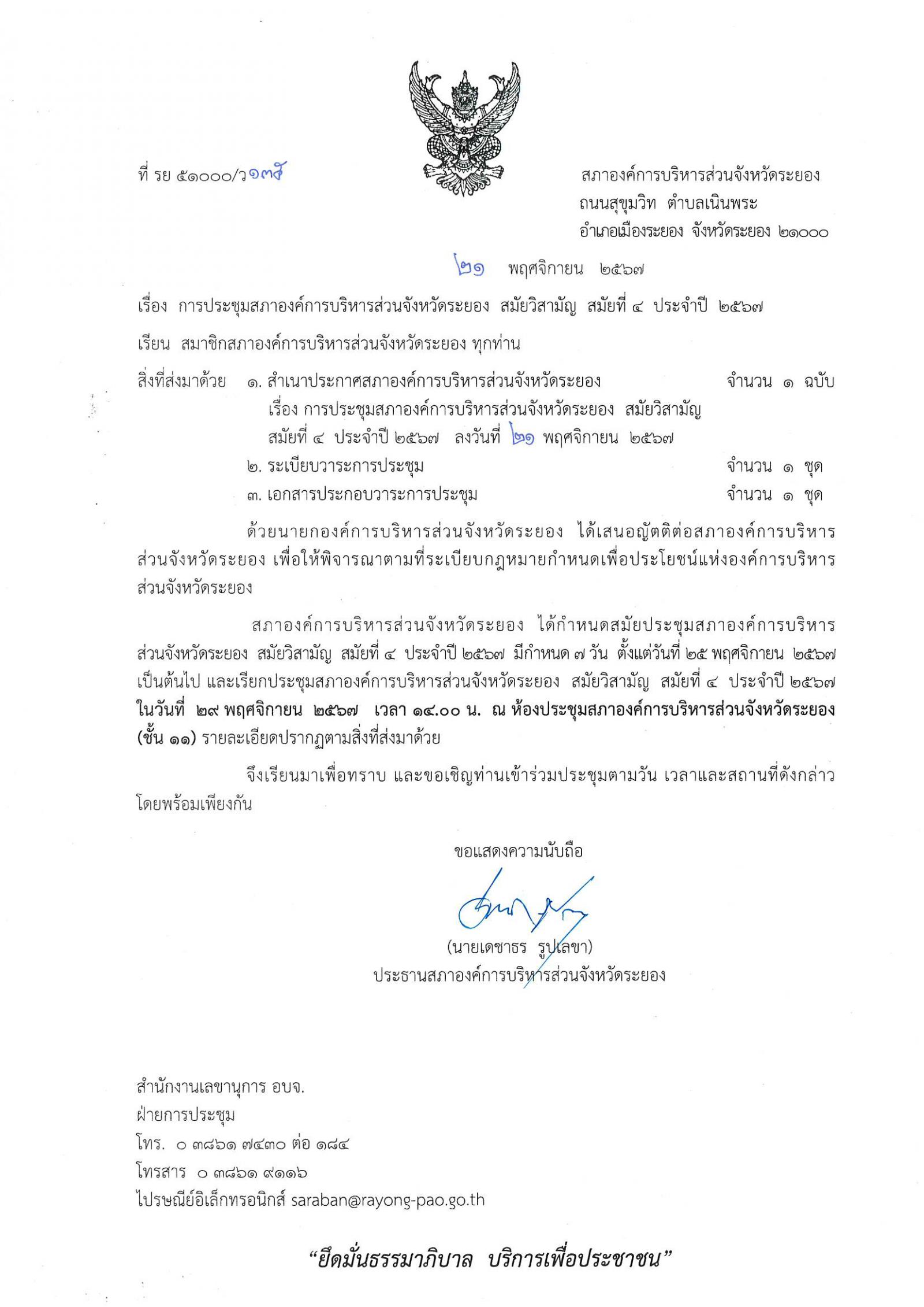 ประชุมสภาองค์การบริหารส่วนจังหวัดระยอง สมัยวิสามัญ สมัยที่ ๔ ประจำปี ๒๕๖๗ ในที่ ๒๙ พฤศจิกายน ๒๕๖๗