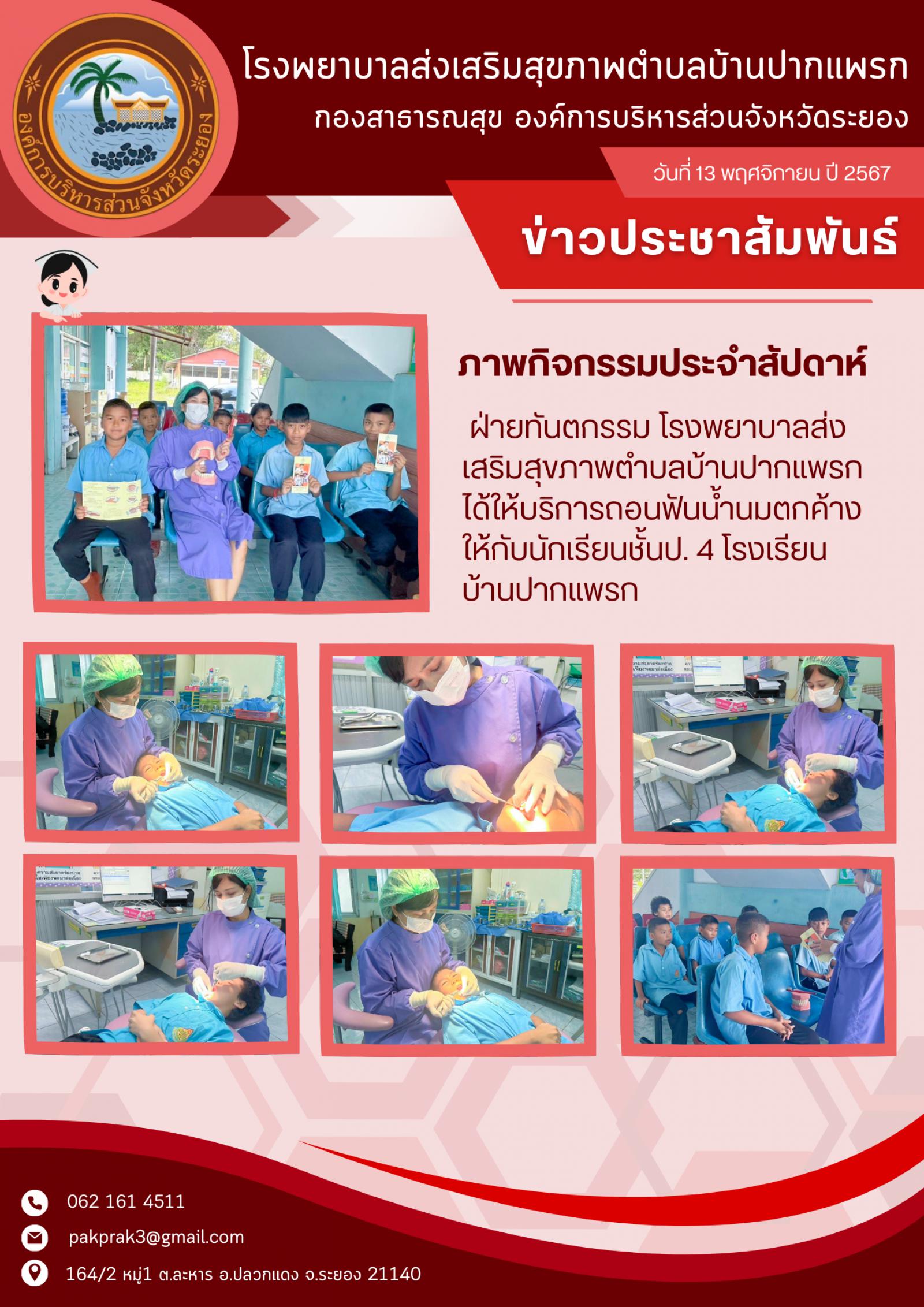 วันที่ 13 พ.ย. 2567 ฝ่ายทันตกรรม ได้ให้บริการถอนฟันน้ำนมตกค้างให้กับเด็กนักเรียนชั้น ป.4 โรงเรียนบ้านปากแพรก