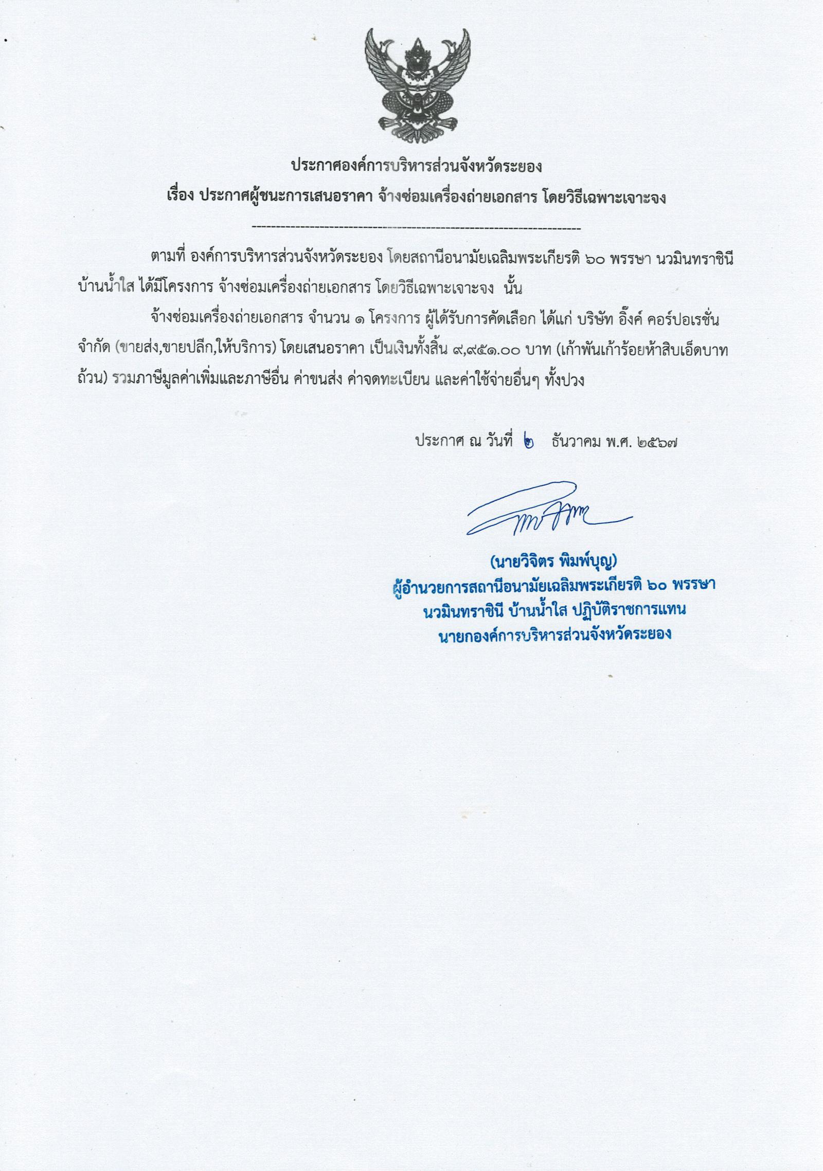 ประกาศผู้ชนะการเสนอราคา จ้างซ่อมเครื่องถ่ายเอกสาร โดยวิธีเฉพาะเจาะจง
