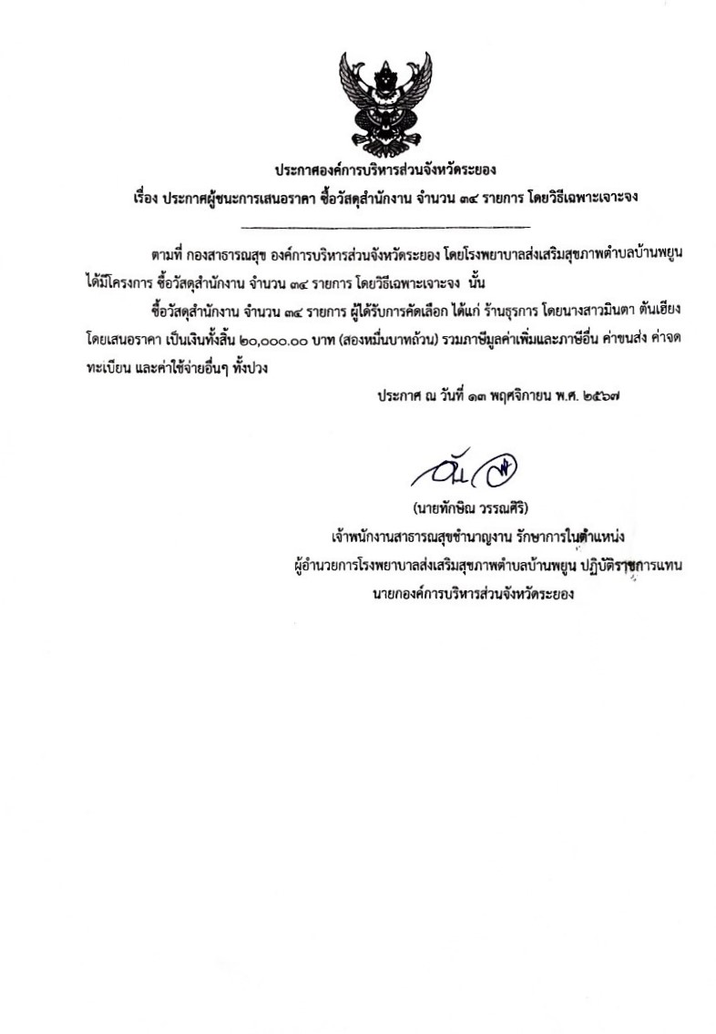 ประกาศผู้ชนะการเสนอราคา ซื้อวัสดุสำนักงาน จำนวน 34 รายการ โดยวิธีเฉพาะเจาะจง