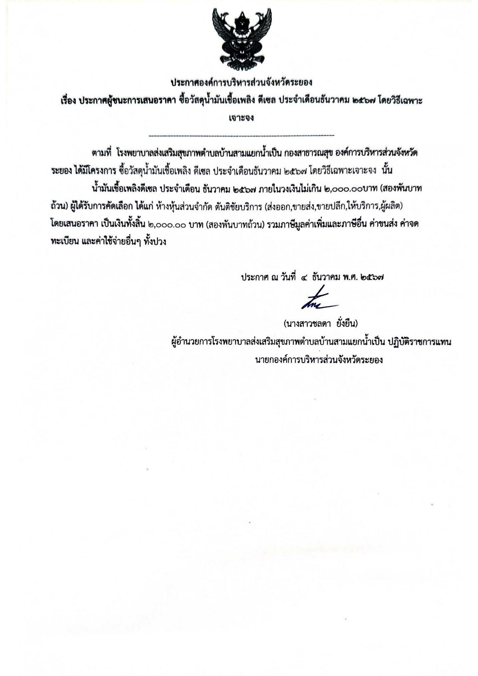 ประกาศผู้ชนะการเสนอราคา ซื้อวัสดุน้ำมันเชื้อเพลิง ดีเซล ประจำเดือนธันวาคม 2567 โดยวิธีเฉพาะเจาะจง