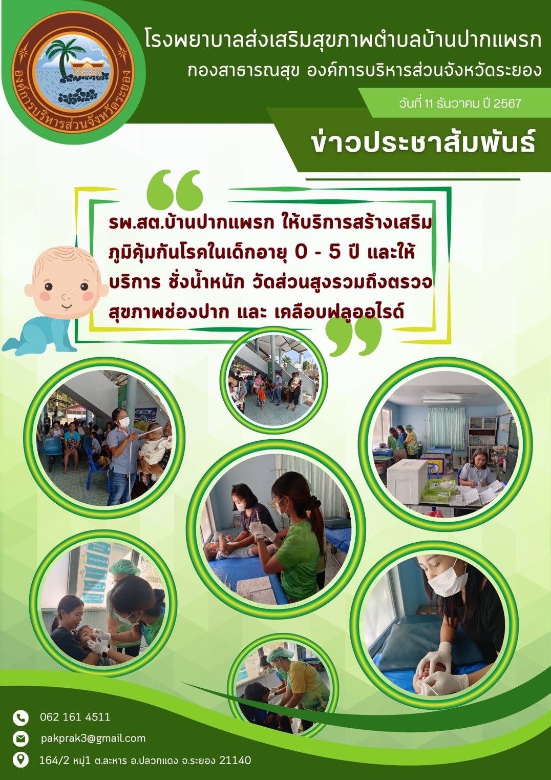 วันที่ 11 ธันวาคม 2567 รพ.สต.บ้านปากแพรก ให้บริการสร้างเสริมภูมิคุ้มกันโรคในเด็กอายุ 0-5 ปี และให้บริการชั่งน้ำหนัก วัดส่วนสูง รวมถึงตรวจสุขภาพช่องปาก และเคลือบฟลูออไรด์