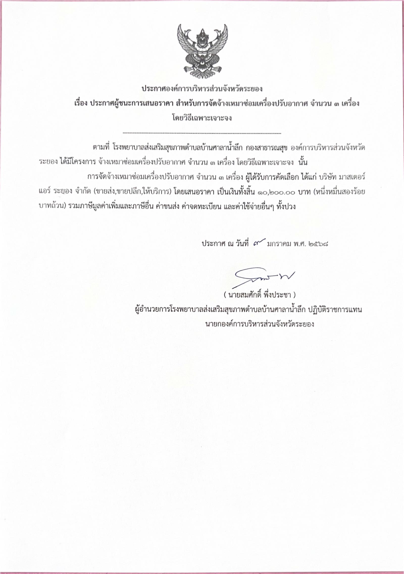 ประกาศผู้ชนะการเสนอราคา สำหรับการจัดจ้างเหมาซ่อมเครื่องปรับอากาศ จำนวน 3 เครื่อง โดยวิธีเฉพาะเจาะจง