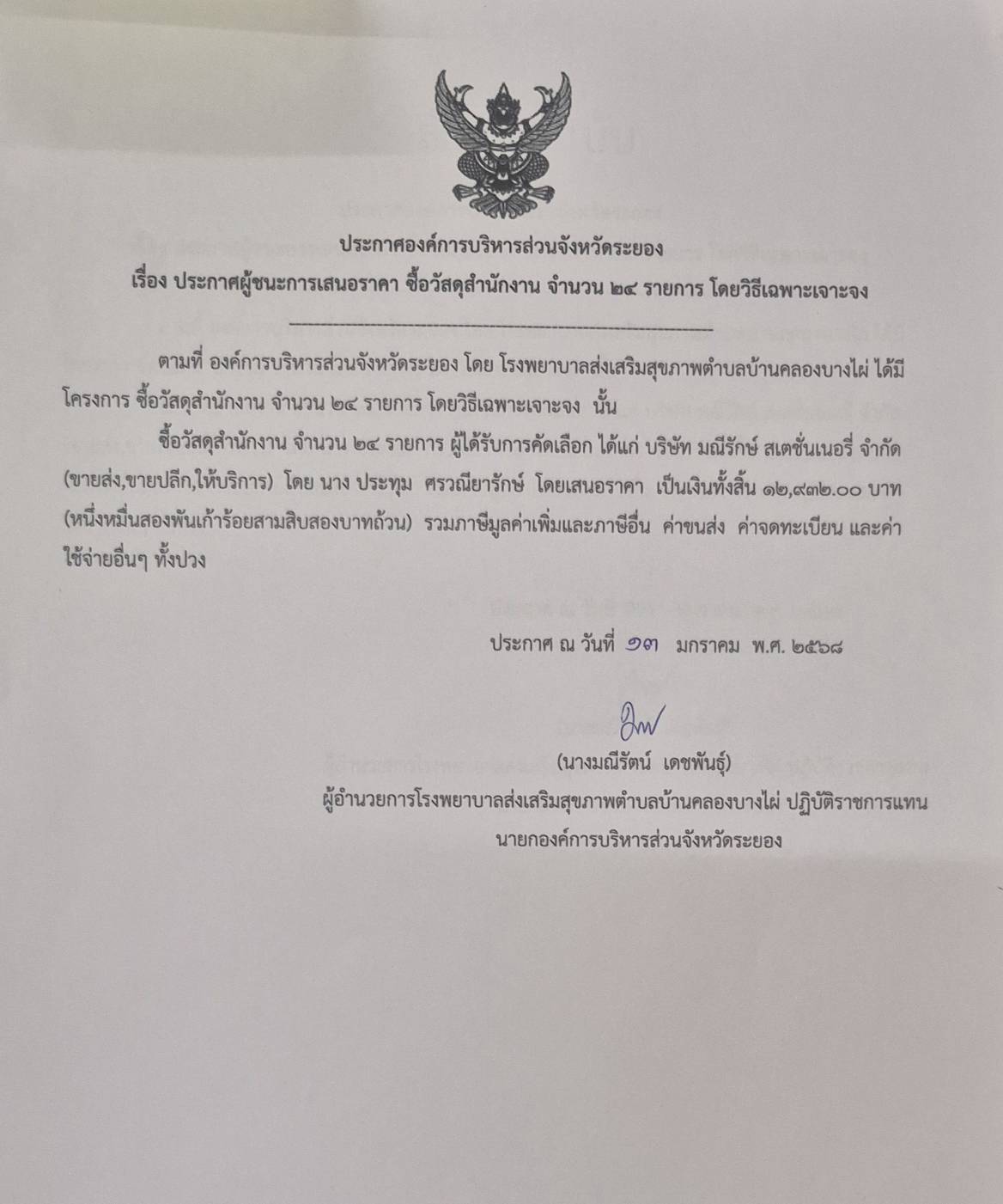 ประกาศผู้ชนะการเสนอราคา ซื้อวัสดุสำนักงาน จำนวน 24 รายการ โดยวิธีเฉพาะเจาะจง