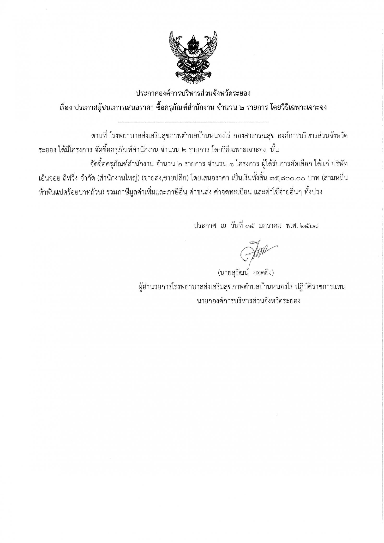 ประกาศผู้ชนะการเสนอราคา ซื้อครุภัณฑ์สำนักงาน จำนวน 2 รายการ โดยวิธีเฉพาะเจาะจง