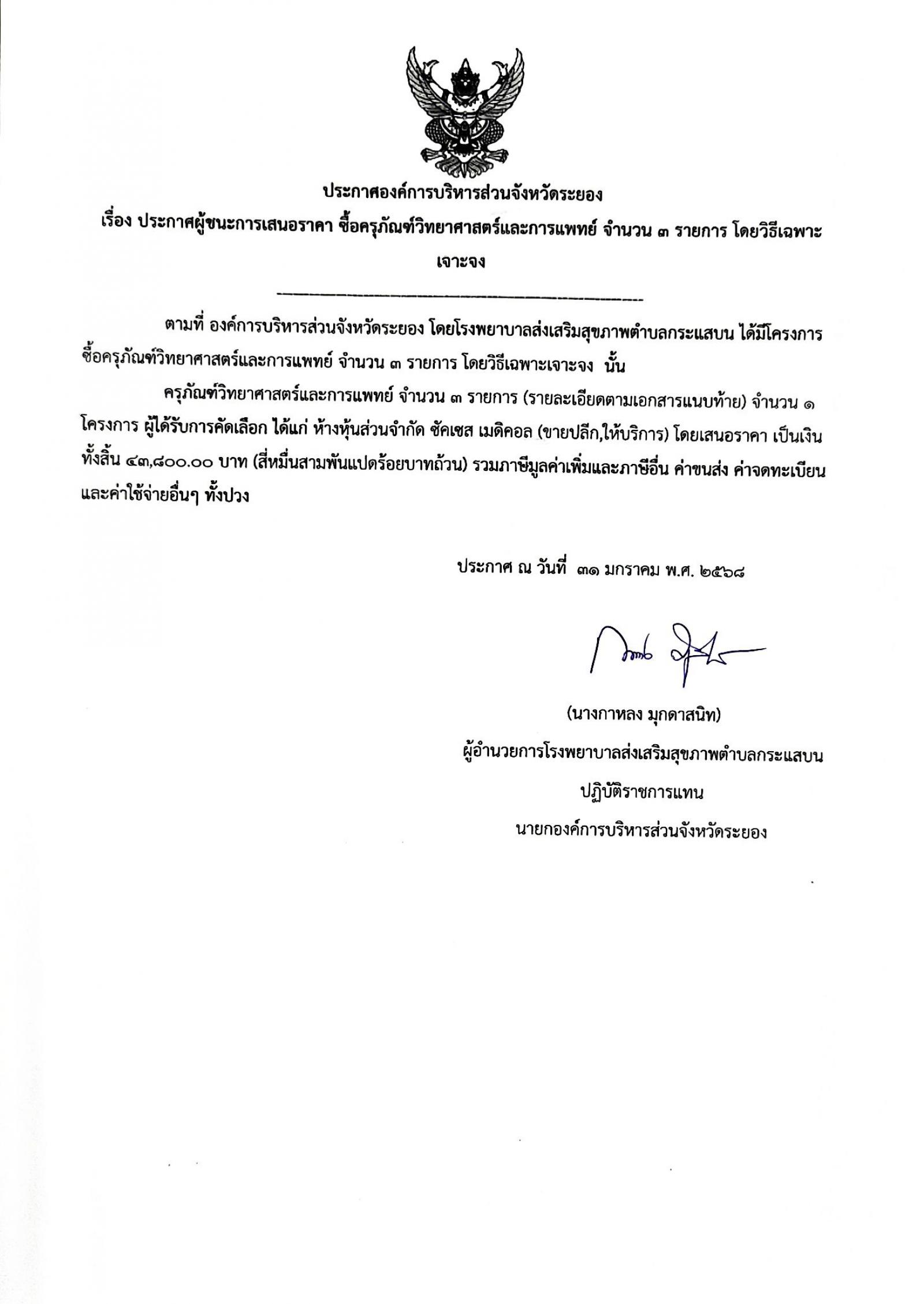 ประกาศผู้ชนะการเสนอราคา ซื้อครุภัณฑ์วิทยาศาสตร์และการแพทย์ จำนวน 3 รายการ โดยวิธีเฉพาะเจาะจง