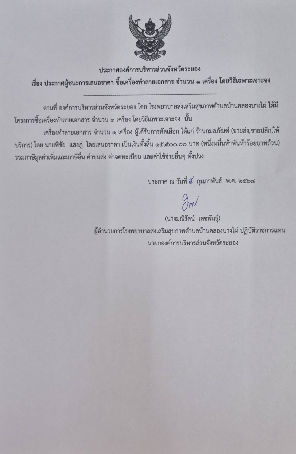 รพ.สต.บ้านคลองบางไผ่ > ข่าวสาร ประกาศ ประกาศผู้ชนะการเนสอราคา ซื้อเครื่องทำลายเอกสาร จำนวน 1 เครื่อง โดยวิธีเฉพาะเจาะจง