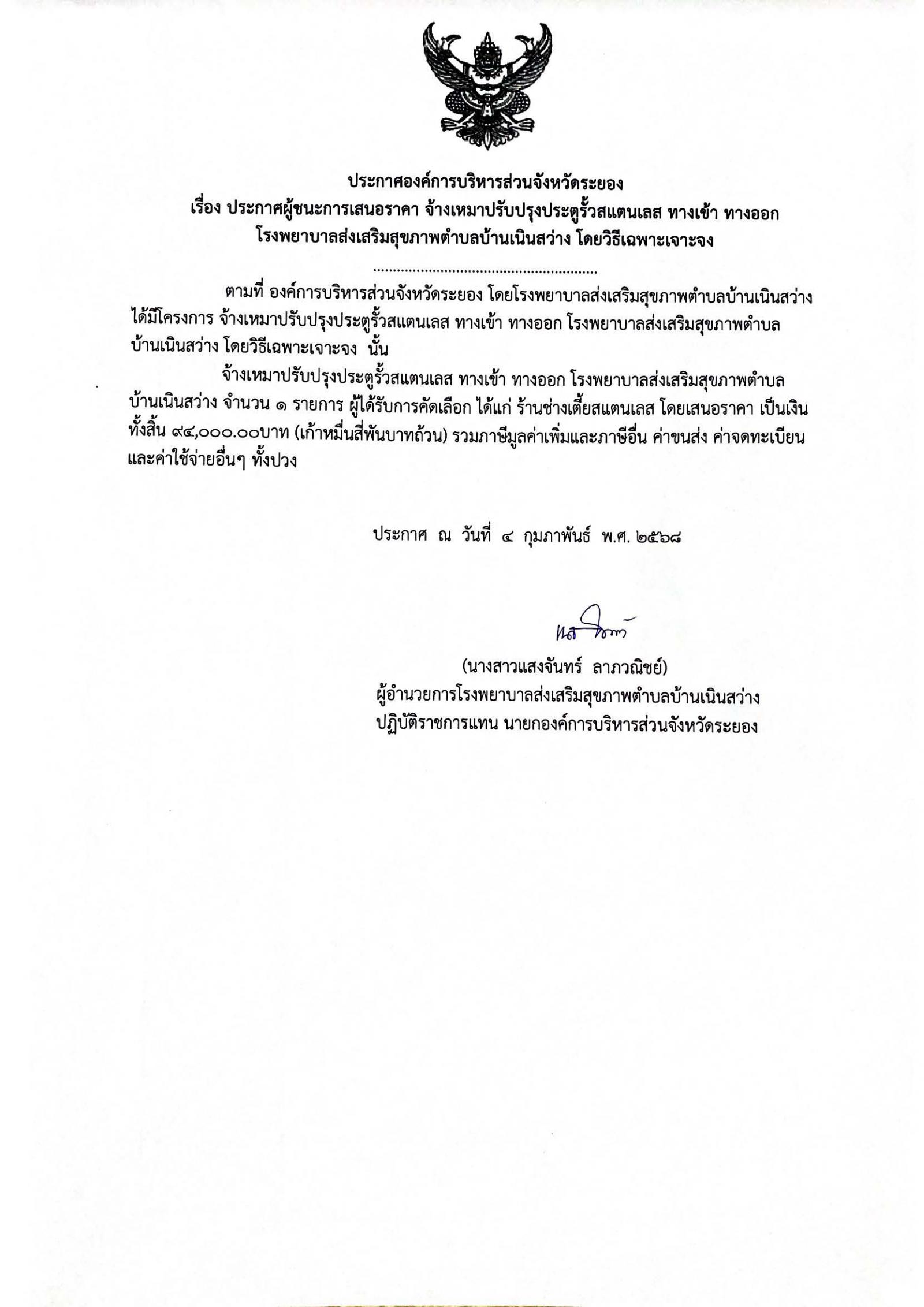 ประกาศผู้ชนะการเสนอราคา จ้างเหมาบริการปรับประตูรั้วสแตนเลส ทางเข้า ทางออก รพ.สต.บ้านเนินสว่าง โดยวิธีเฉพาะเจาะจง