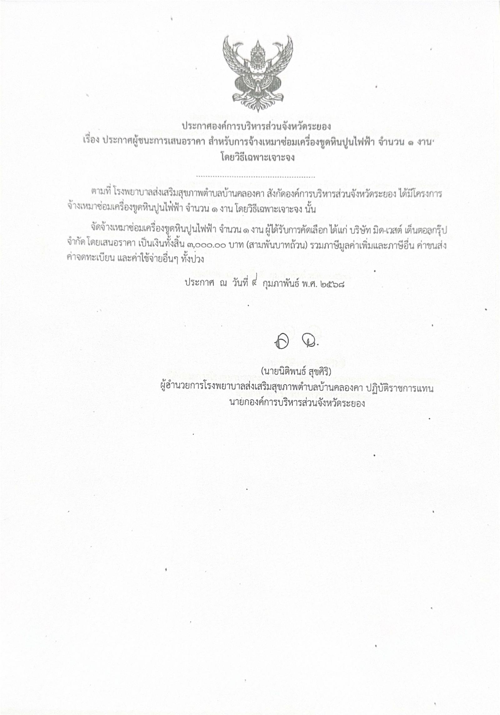 ประกาศผู้ชนะการเสนอราคา สำหรับการจ้างเหมาซ่อมเครื่องขูดหินปูนไฟฟ้า จำนวน 1 งาน โดยวิธีเฉพาะเจาะจง