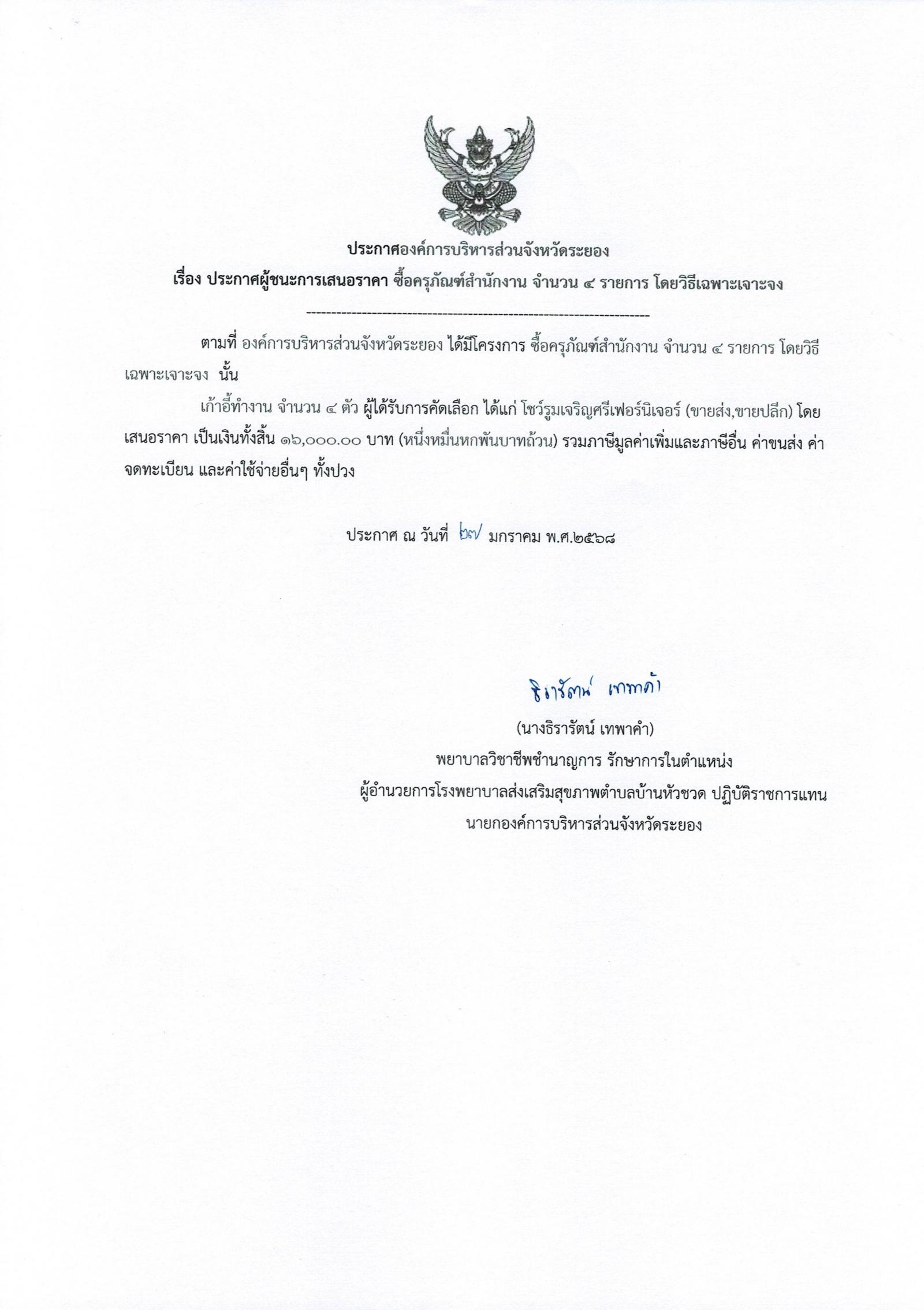 ประกาศผู้ชนะการเสนอราคา ซื้อครุภัณฑ์สำนักงาน จำนวน 4 รายการ โดยวิธีเฉพาะเจาะจง