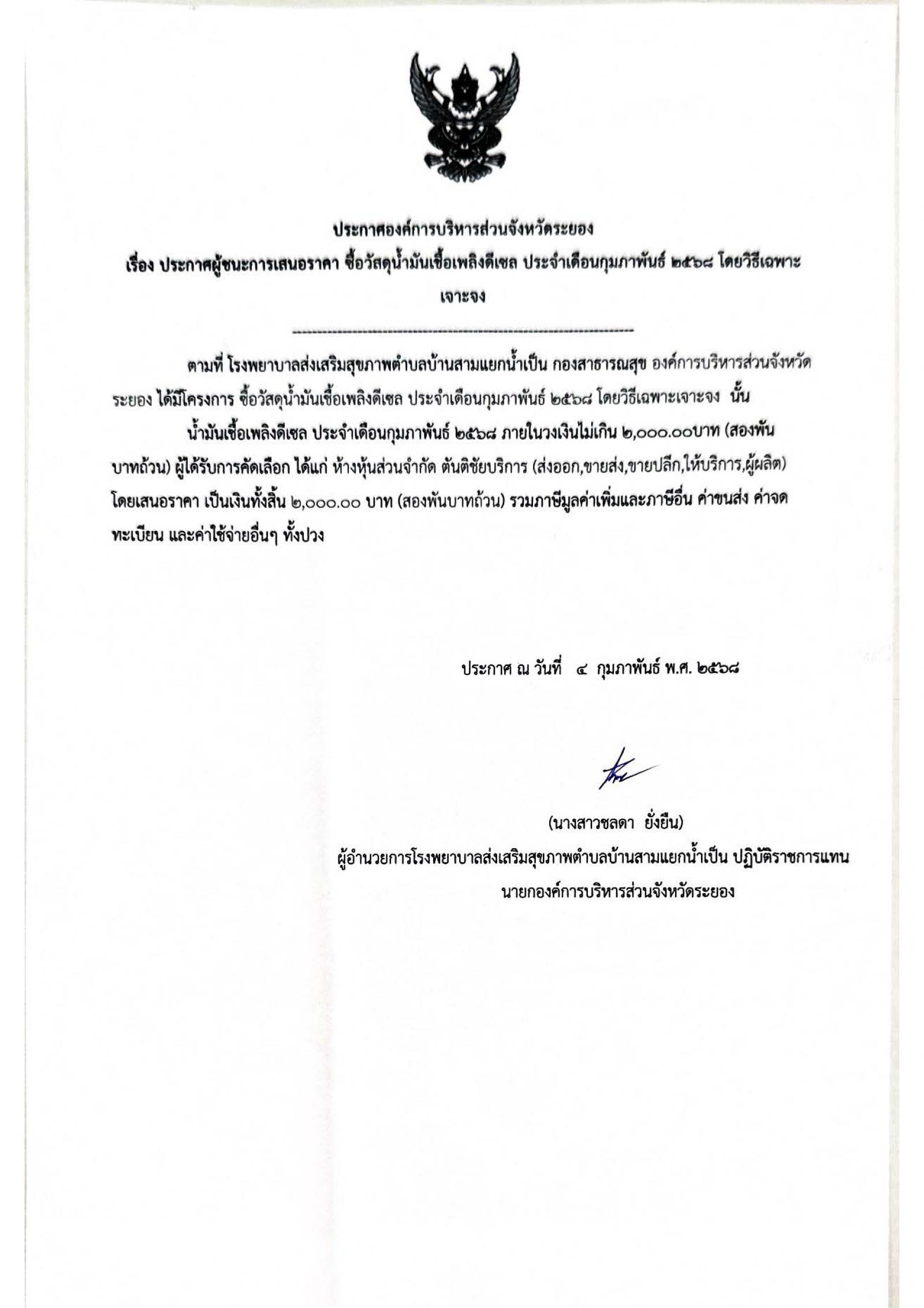 ประกาศผู้ชนะการเสนอราคา ซื้อวัสดุน้ำมันเชื้อเพลิงดีเซล ประจำเดือนกุมภาพันธ์ 2568 โดยวิธีเฉพาะเจาะจง