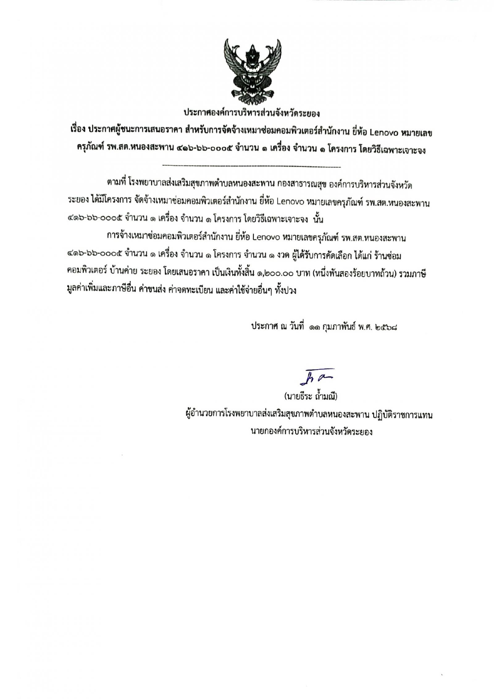 ประกาศผู้ชนะการเสนอราคา สำหรับการจัดจ้างเหมาซ่อมคอมพิวเตอร์สำนักงาน