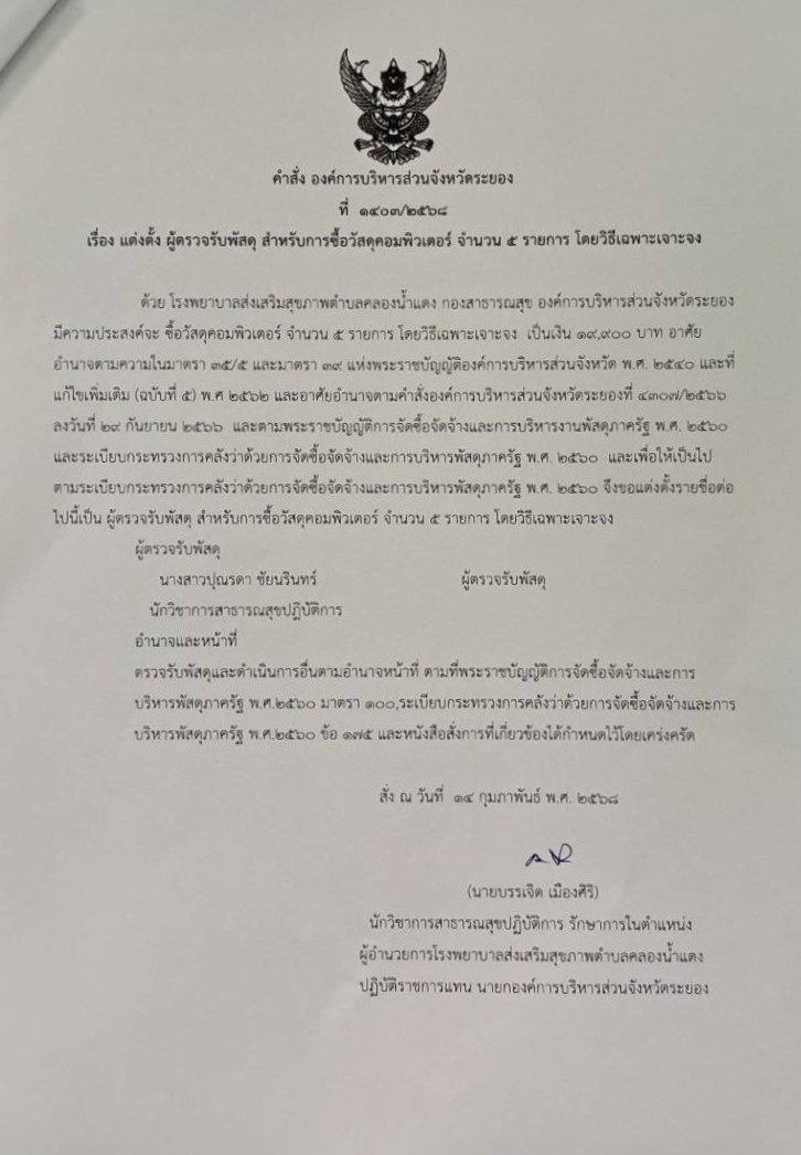 คำสั่ง แต่งตั้ง ผู้ตรวจรับพัสดุ สำหรับการซื้อวัสดุคอมพิวเตอร์ จำนวน 5 รายการ โดยวิธีเฉพาะเจาะจง