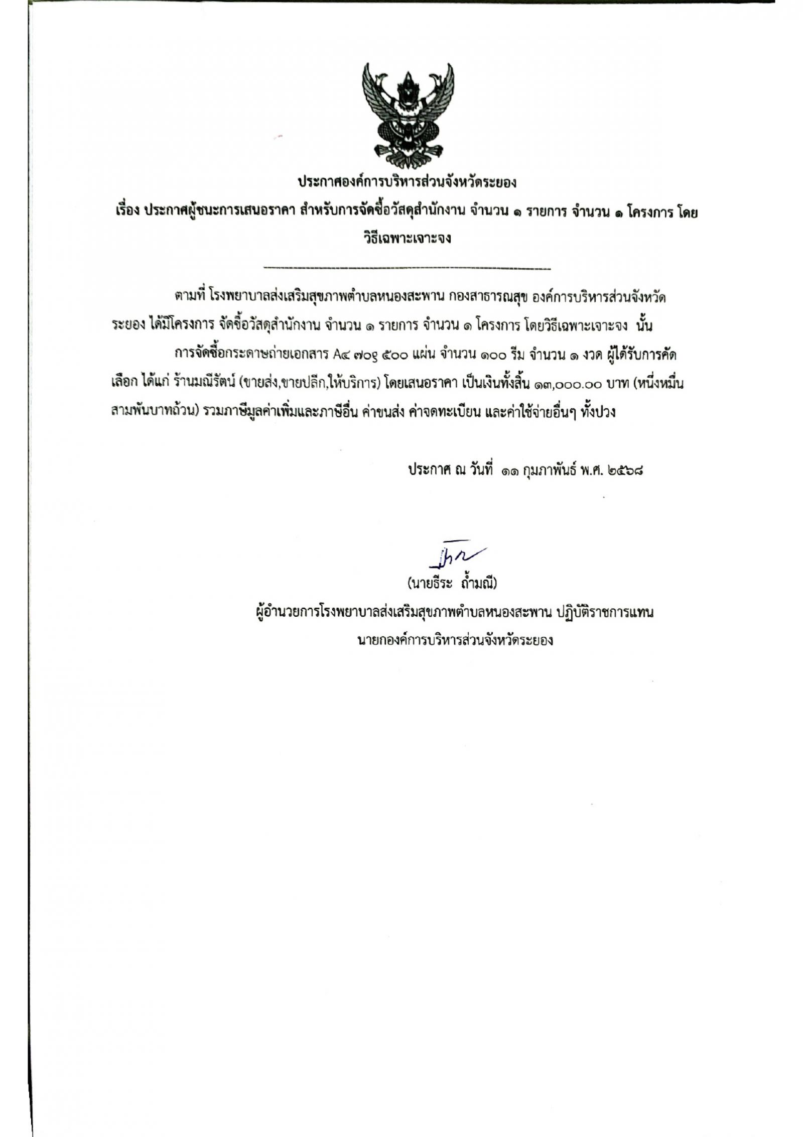 ประกาศผู้ชนะการเสนอราคา สำหรับการจัดซื้อวัสดุสำนักงาน จำนวน 1 รายการ