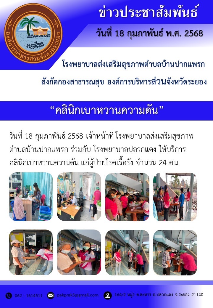 วันที่ 18 กุมภาพันธ์ 2568 รพ.สต.บ้านปากแพรก ร่วมกับ รพ.ปลวกแดง ให้บริการคลินิกเบาหวานความดัน แก่ผู้ป่วยโรคเรื้อรัง จำนวน 24 คน