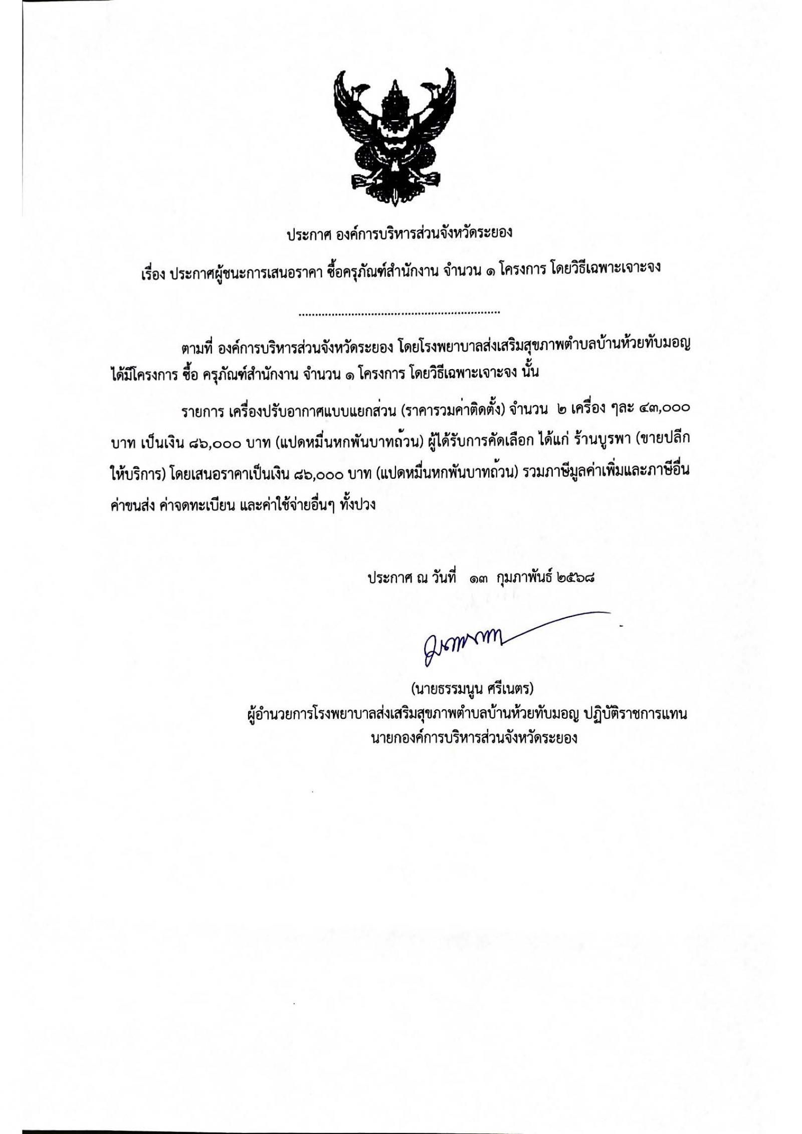 ประกาศผู้ชนะการเสนอราคา ซื้อวัสดุสำนักงาน จำนวน 13 รายการ โดยวิธีเฉพาะเจาะจง