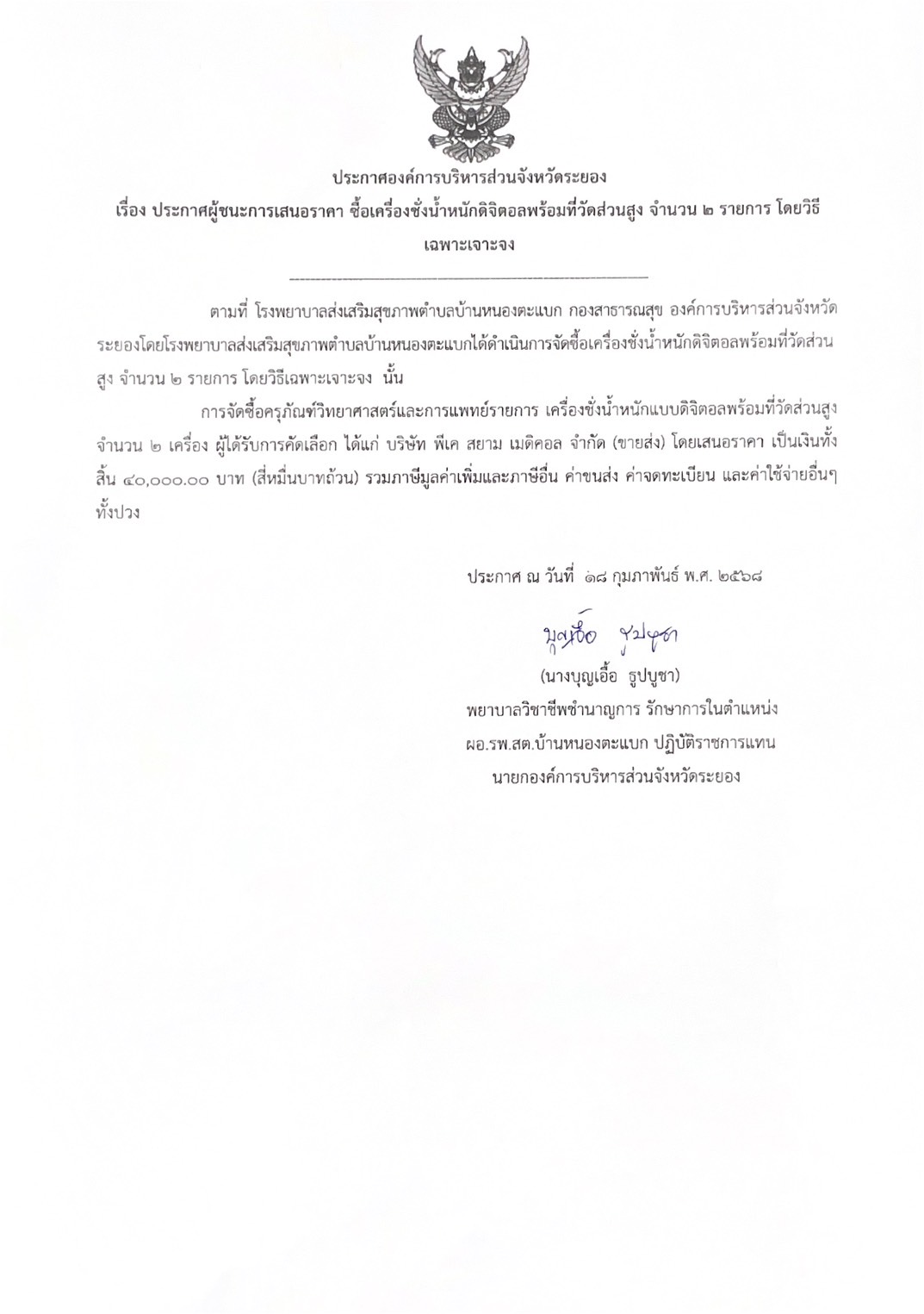 ประกาศผู้ชนะการเสนอราคา ซื้อเครื่องชั่งน้ำหนักดิจิตอลพร้อมที่วัดส่วนสูง จำนวน 2 รายการ โดยวิธีเฉพาะเจาะจง