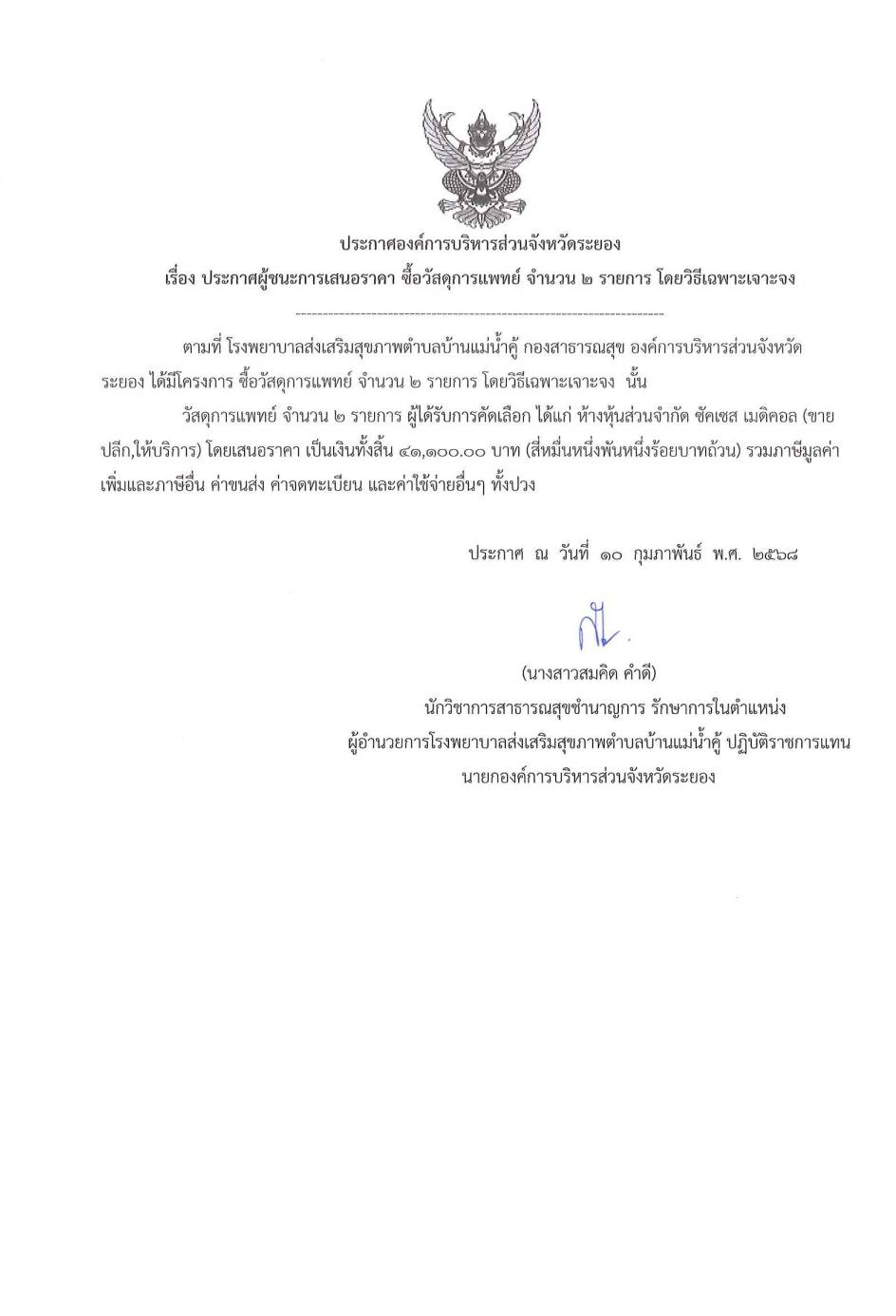 ประกาศผู้ชนะการเสนอราคาซื้อวัสดุการแพทย์ จำนวน - รายการ โดยวิธีเฉพาะเจาะจง