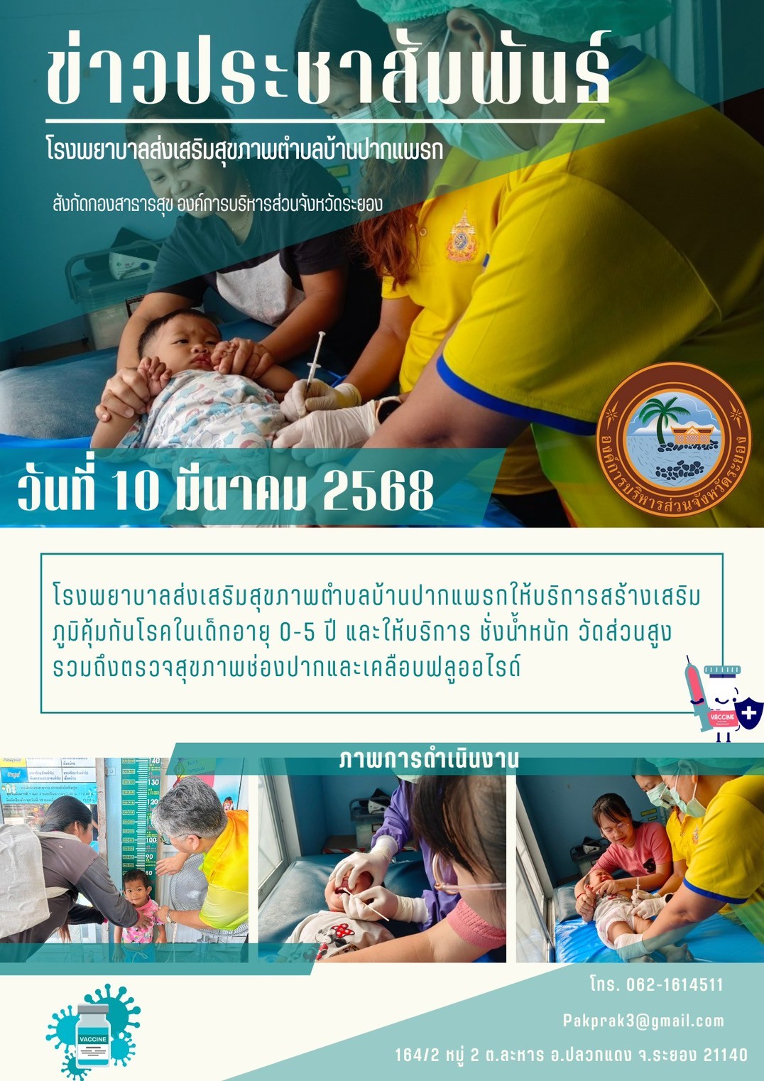 วันที่ 10 มีนาคม 2568 รพ.สต.บ้านปากแพรกให้บริการสร้างเสริมภูมิคุ้มกันโรคในเด็กอายุ 0-5 ปี และให้บริการ ชั่งน้ำหนัก วัดส่วนสูง รวมถึงตรวจสุขภาพช่องปากและเคลือบฟูออไรด์