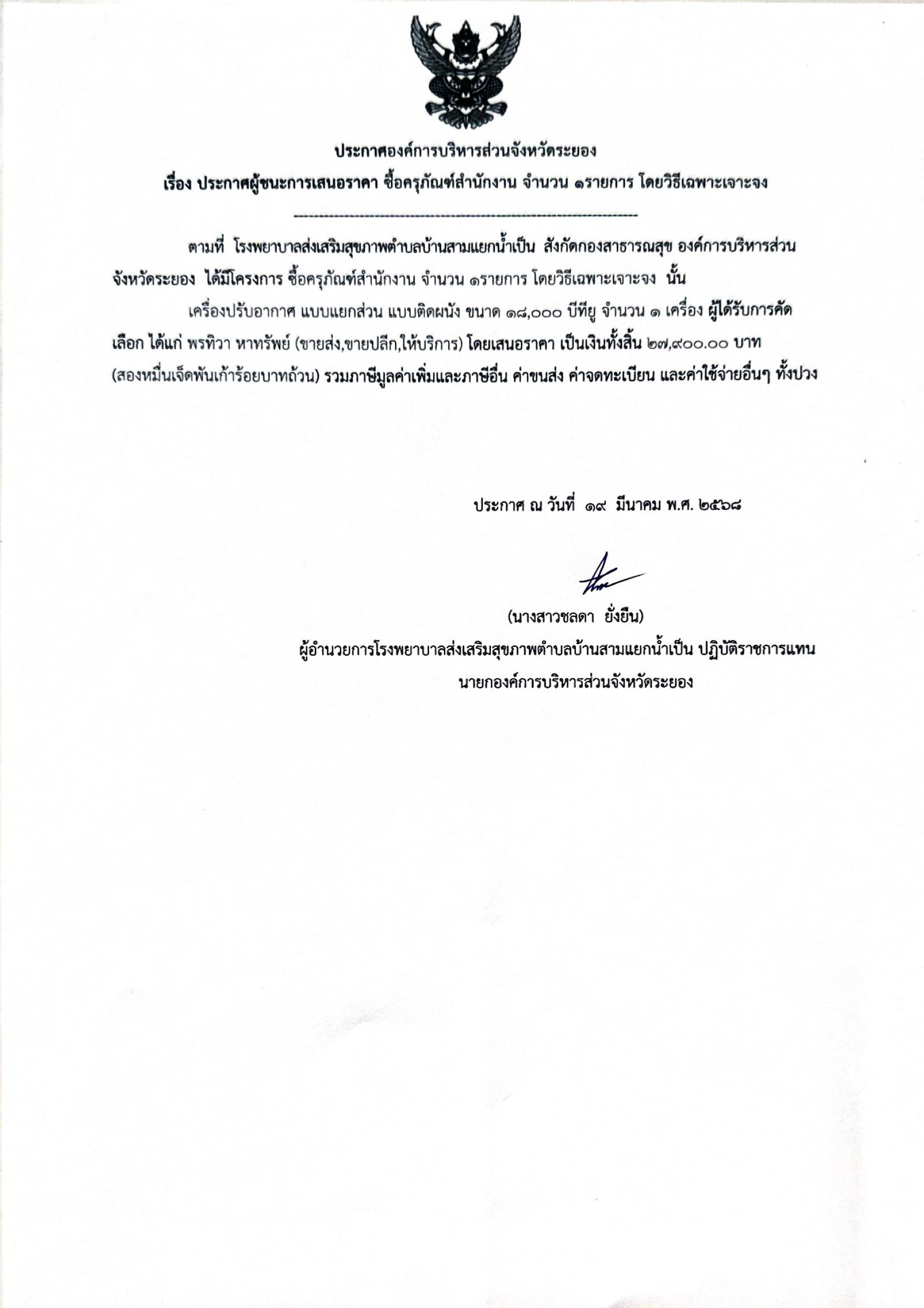 ประกาศผู้ชนะการเสนอราคา ซื้อครุภัณฑ์สำนักงาน จำนวน 1 รายการ โดยวิธีเฉพาะเจาะจง