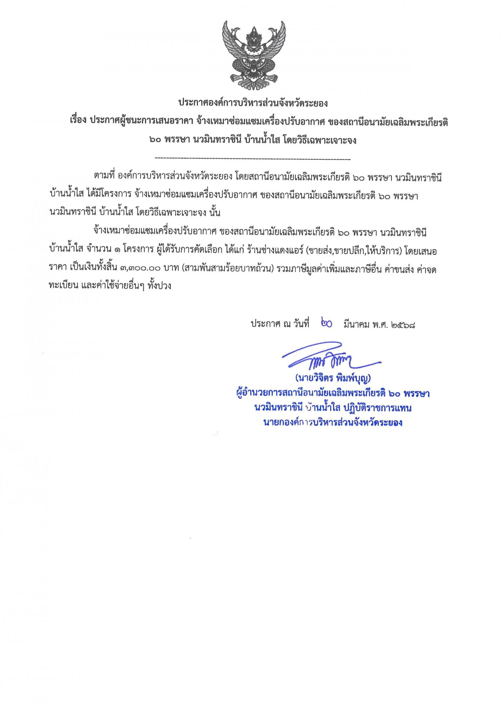 ประกาศผู้ชนะการเสนอราคา จ้างเหมาซ่อมแซมเครื่องปรับอากาศ ของสถานีอนามัยเฉลิมพระเกียรติ ๖๐ พรรษา นวมินทราชินี บ้านน้ำใส โดยวิธีเฉพาะเจาะจง
