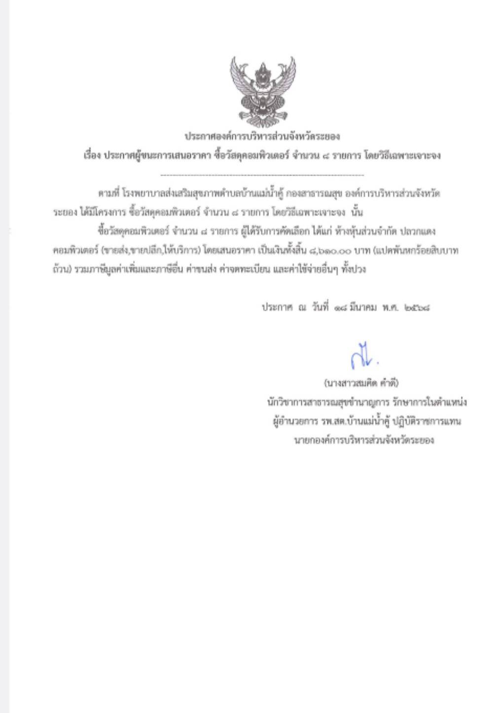 ประกาศผู้ชนะการเสนอราคา ซื้อวัสดุคอมพิวเตอร์ จำนวน 8 รายการ โดยวิธีเฉพาะเจาะจง