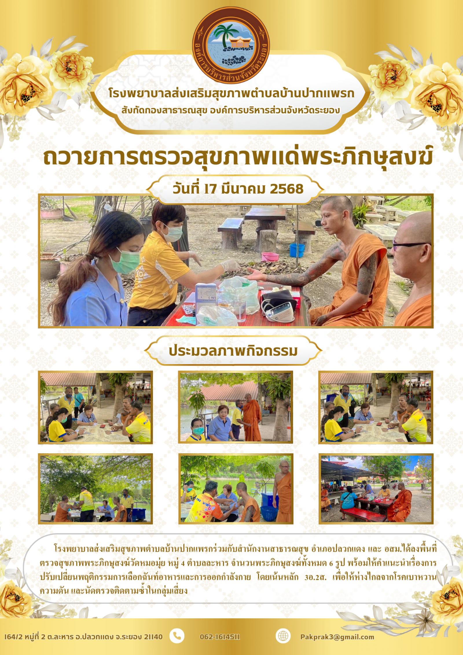 วันที่ 17 มีนาคม 2568 รพ.สต.บ้านปากแพรก ร่วมกับสาธารณสุขอำเภอปลวกแดง และ อสม.ได้ลงพื้นที่ตรวจสุขภาพพระภิกษุสงฆ์วัดหมอมุ่ย ม.4 ต.ละหาร จำนวน 6 รูป พร้อมให้คำแนะนำเรื่องการปรับเปลี่ยนพฤติกรรมการเลือกฉันท์อาหารและการออกกำลังกายโดยเน้นหลัก 3อ. 2ส.