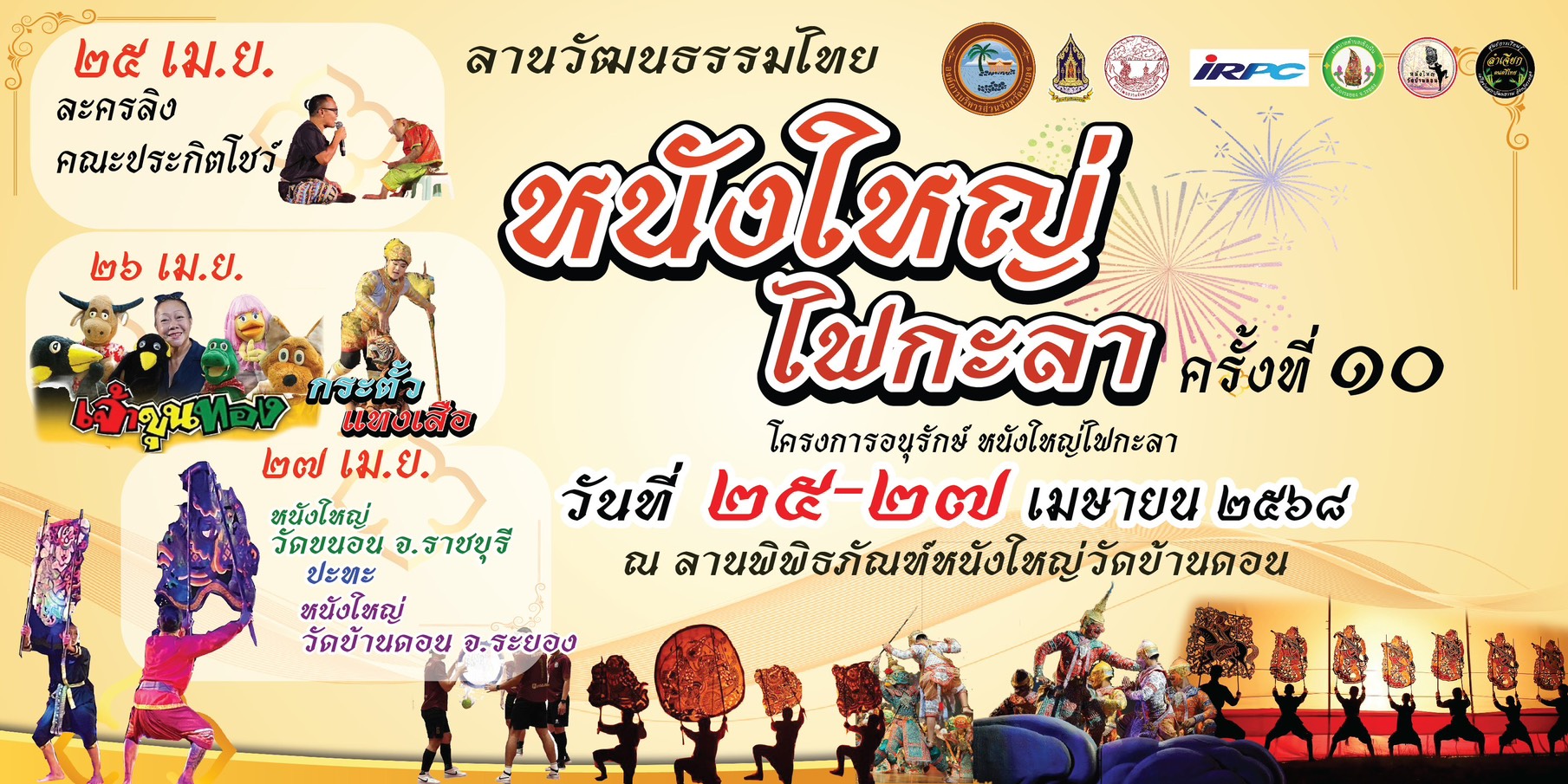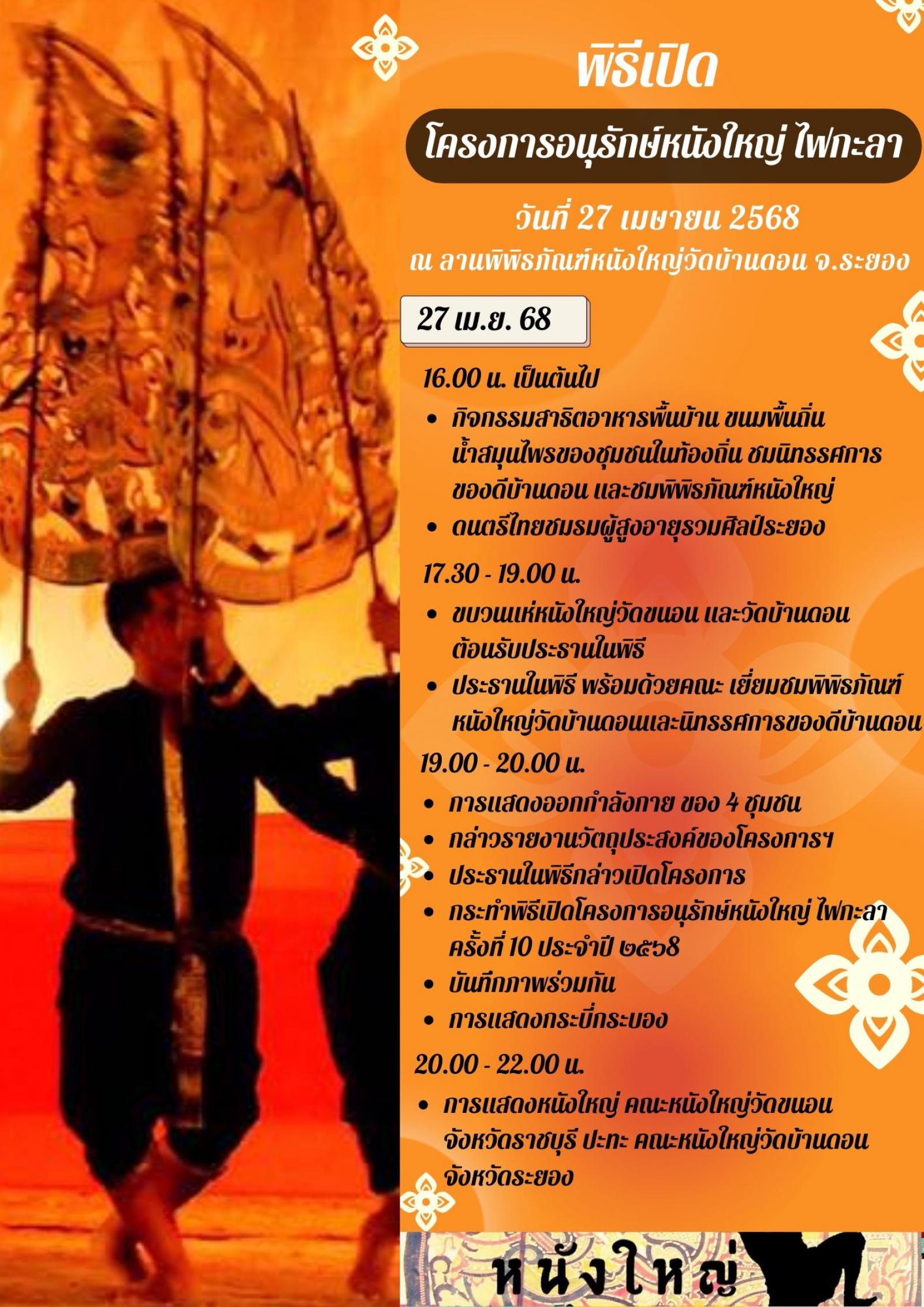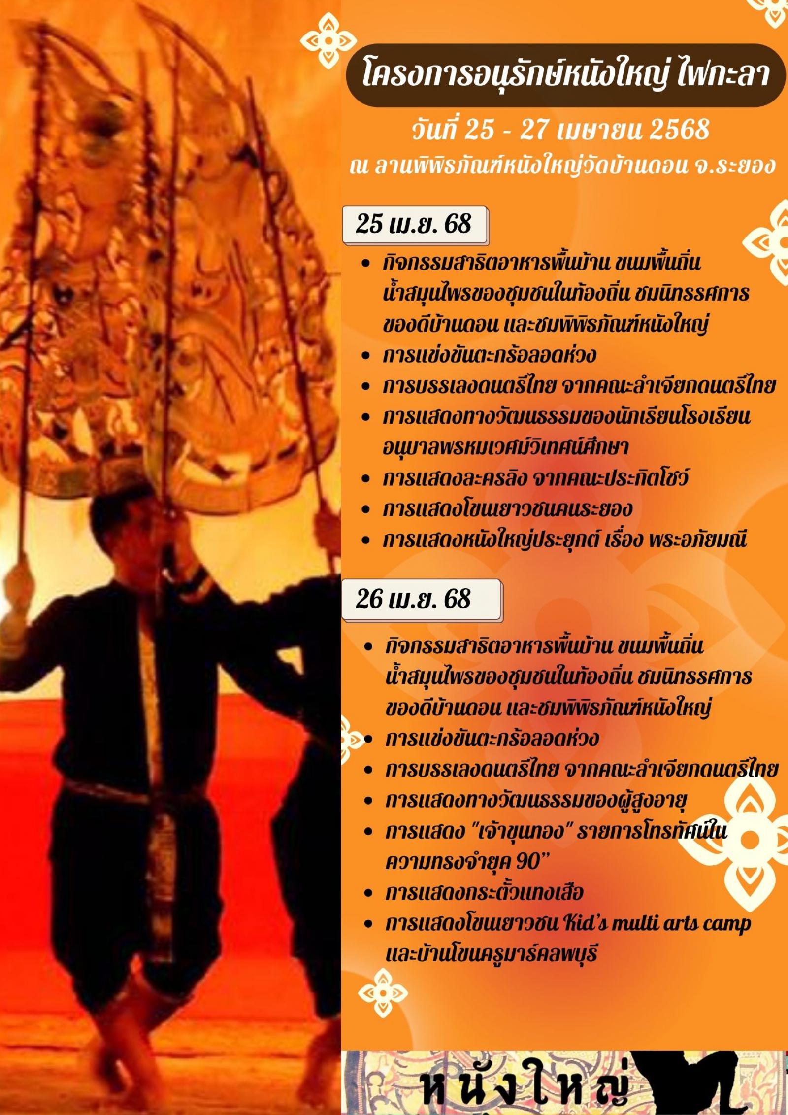 อบจ.ระยอง ขอเชิญเที่ยวงานลานวัฒนธรรมไทย "หนังใหญ่ ไฟกะลา" ครั้งที่ 10 ในโครงการอนุรักษ์หนังใหญ่ ไฟกะลา ระหว่างวันที่ 25 - 27 เมษายน 2568 ตั้งแต่เวลา 17.00 - 22.00 น. ทุกวัน ณ ลานพิพิธภัณฑ์หนังใหญ่วัดบ้านดอน ภายในงานพบกับกิจกรรมการจำหน่ายสินค้า นิทรรศการ ของดีบ้านดอนและของดีจังหวัดระยอง และเยี่ยมชมพิพิธภัณฑ์หนังใหญ่วัดบ้านดอน และการแสดงทางวัฒนธรรมมากมาย