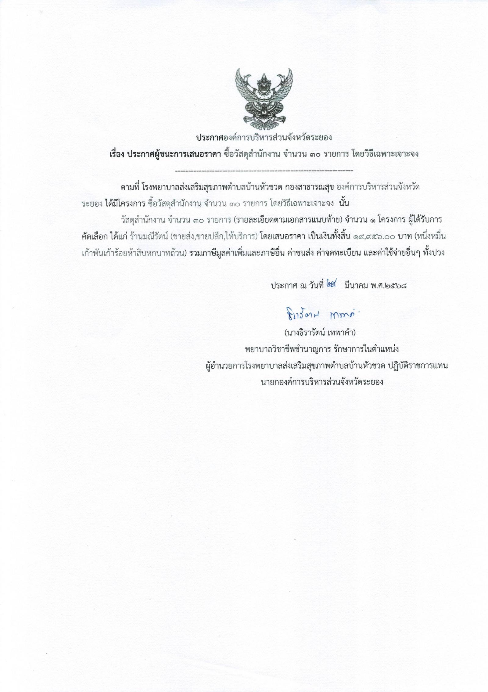 ประกาศผู้ัชนะการเสนอราคา ซื้อวัสดุสำนักงาน จำนวน 30 รายการ โดยวิธีเฉพาะเจาะจง