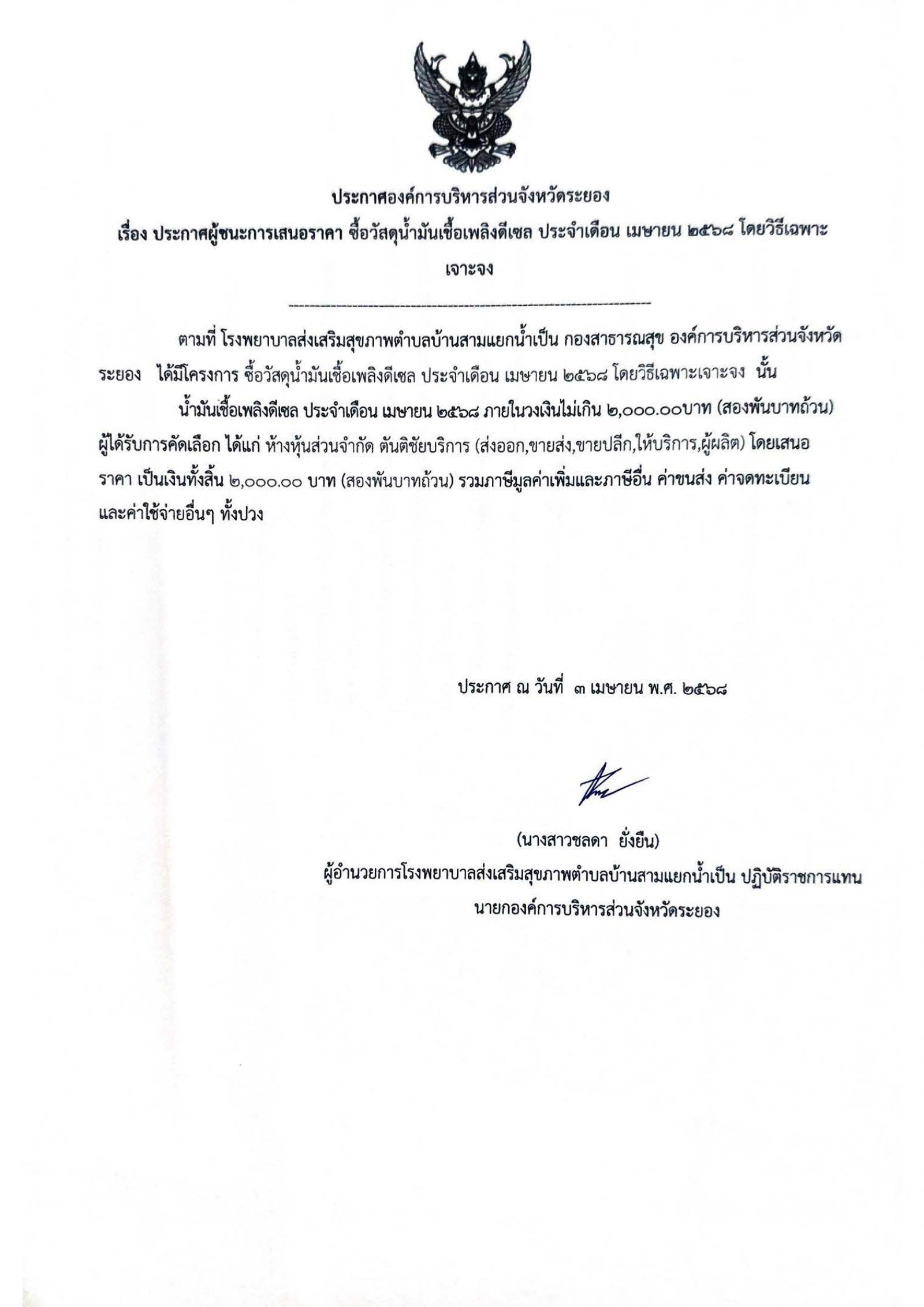 ประกาศผู้ชนะการเสนอราคา ซื้อวัสดุน้ำมันเชื้อเพลิงดีเซล ประจำเดือน เมษายน 2568 โดยวิธีเฉพาะเจาะจง