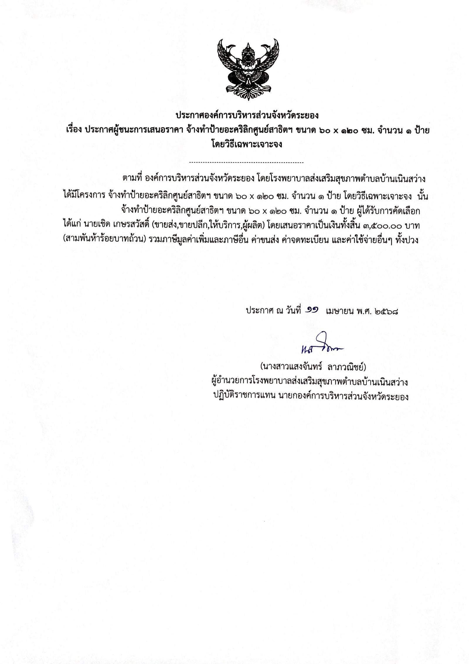 ประกาศผู้ชนะการเสนอราคา จ้างทำป้ายอะคริลิกศูนย์สาธิตฯ ขนาด 60 x 120 ชม.จำนวน 1 ป้าย โดยวิธีเฉพาะเจาะจง