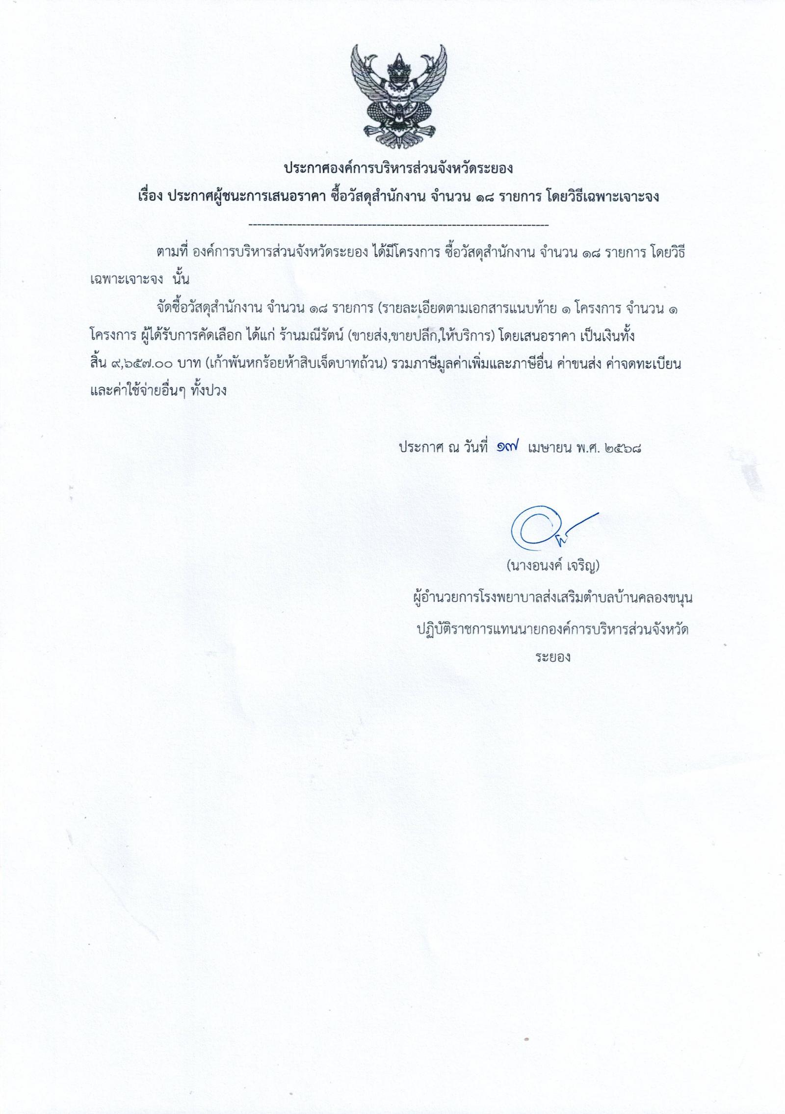 ประกาศผู้ชนะการเสนอราคา ซื้อวัสดุสำนักงาน จำนวน 18 รายการ โดยวิธีเฉพาะเจาะจง