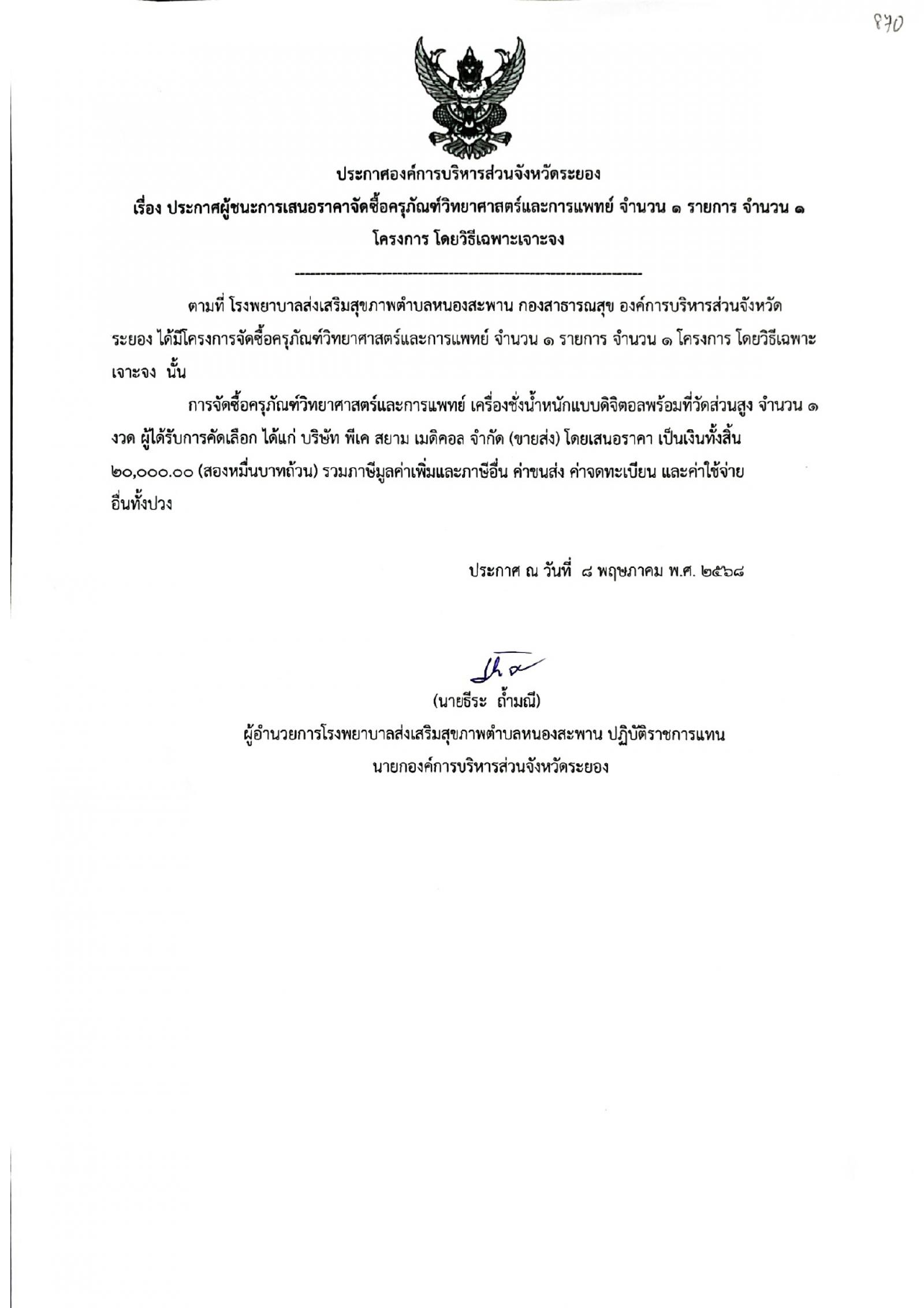 ประกาศผู้ชนะการเสนอราคาจัดซื้อครุภัณฑ์วิทยาศาสตร์และการแพทย์ จำนวน 1 รายการ จำนวน 1 โครงการ โดยวิธีเฉพาะเจาะจง