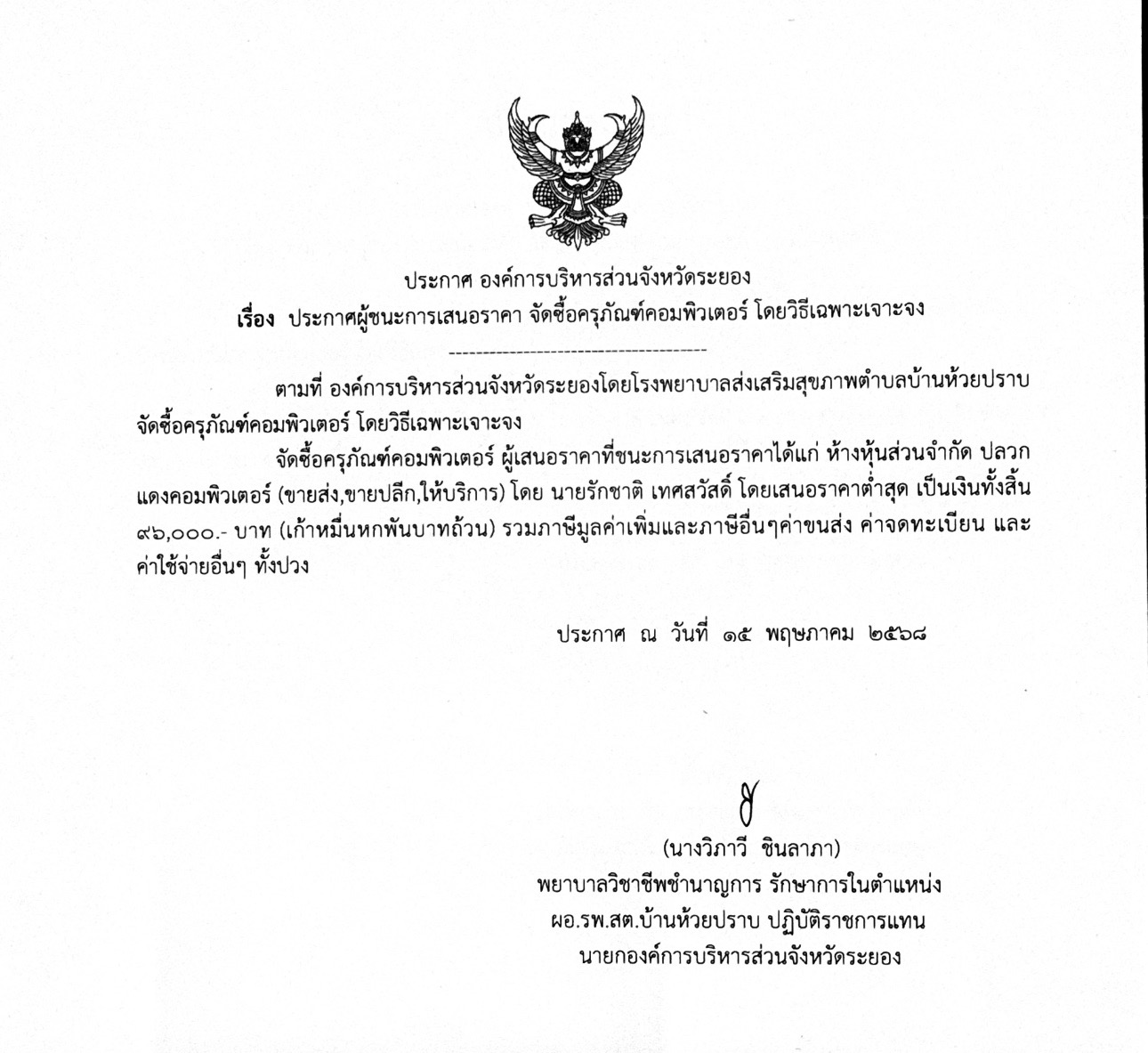 ตามที่ องค์การบริหารส่วนจังหวัดระยองโดยโรงพยาบาลส่งเสริมสุขภาพตำบลบ้านห้วยปราบ จัดซื้อครุภัณฑ์คอมพิวเตอร์ โดยวิธีเฉพาะเจาะจง